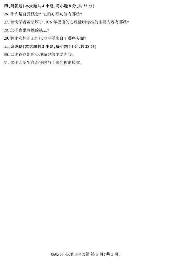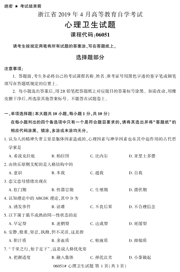 真题下载:全国2019年4月自考06051心理卫生试题.pdf