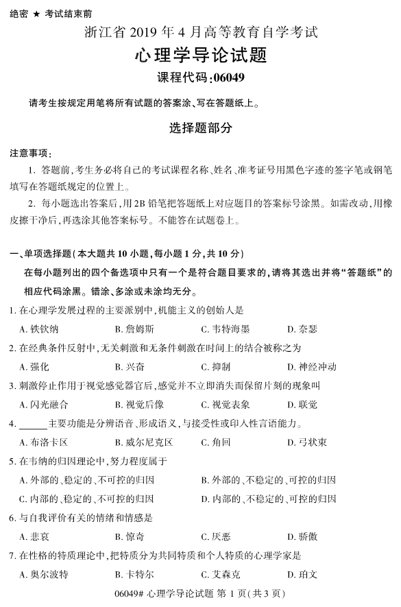 • 所在位置:浙江自考网 > 自考试卷 > 全国2019年4月自考06049心理学导论试题