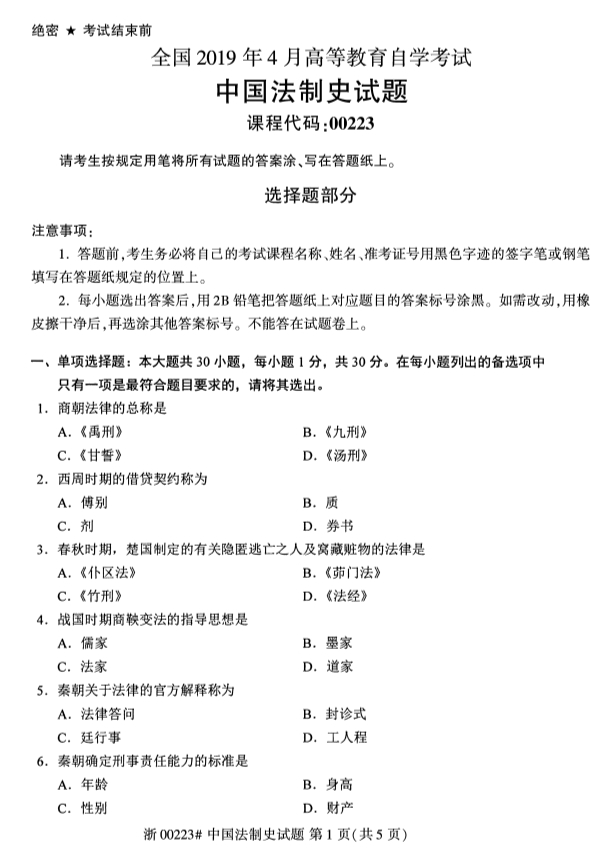 真题下载:浙江省2019年4月自考00223中国法制史试题