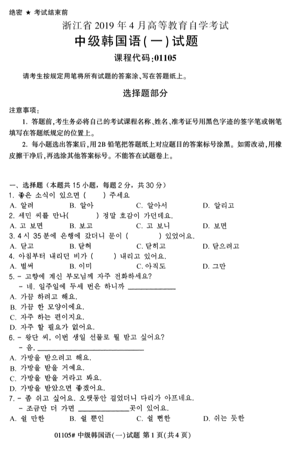 真题下载:浙江省2019年4月自考01105中级韩国(一)试题