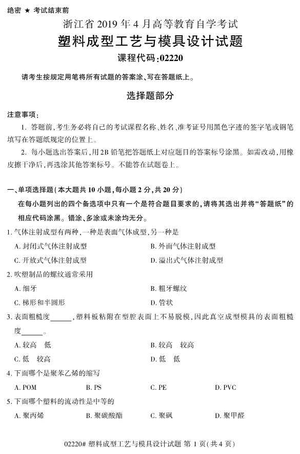 真题下载:全国2019年4月自考02220塑料成型工艺与模具设计试题