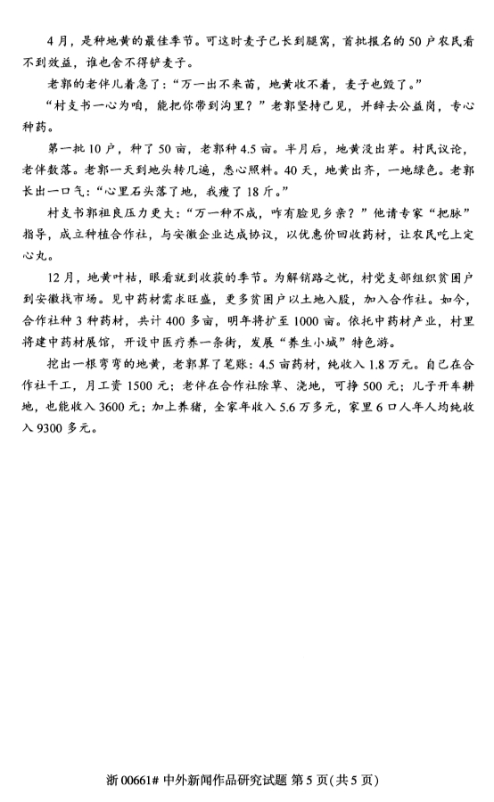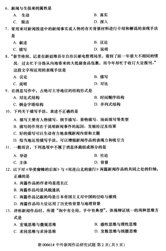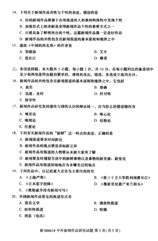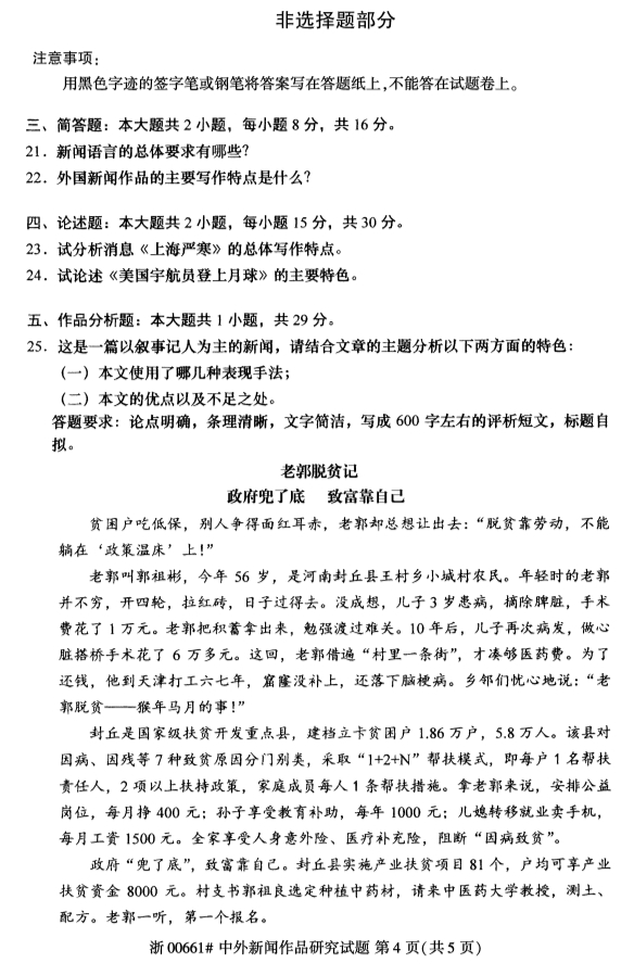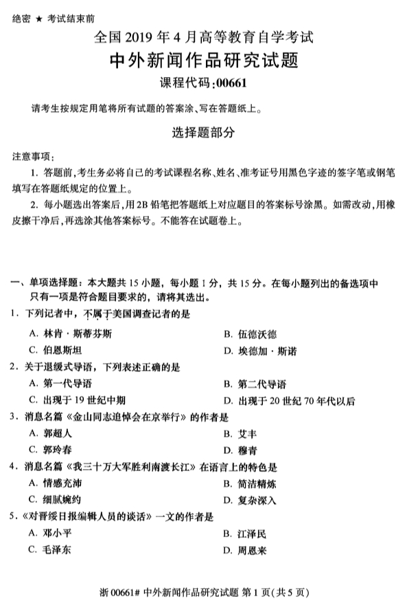 全国2019年4月自考00661中外新闻作品研究试题
