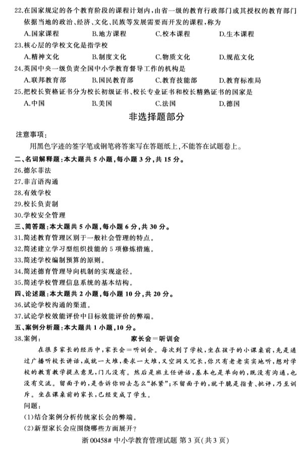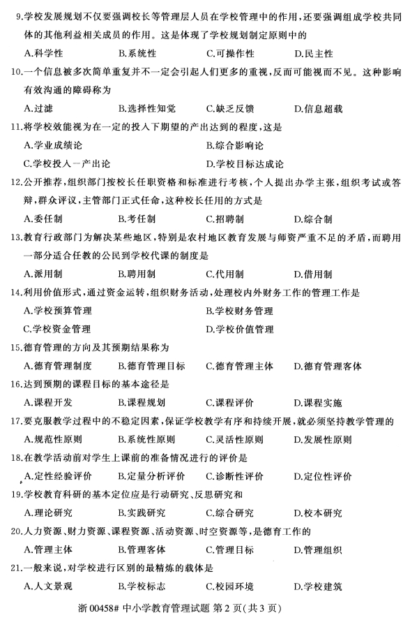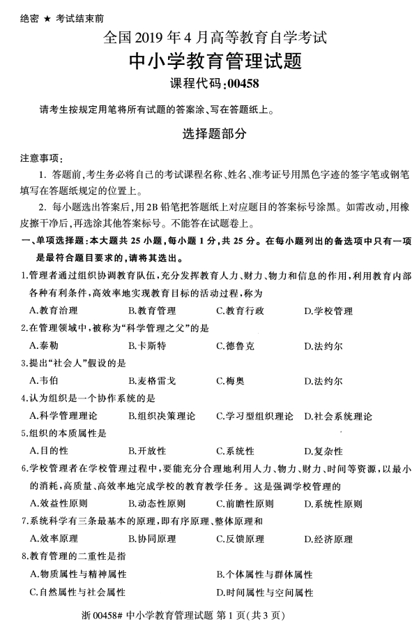 真题下载:浙江省2019年4月自考00458中小学教育管理试题