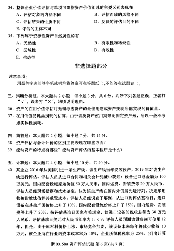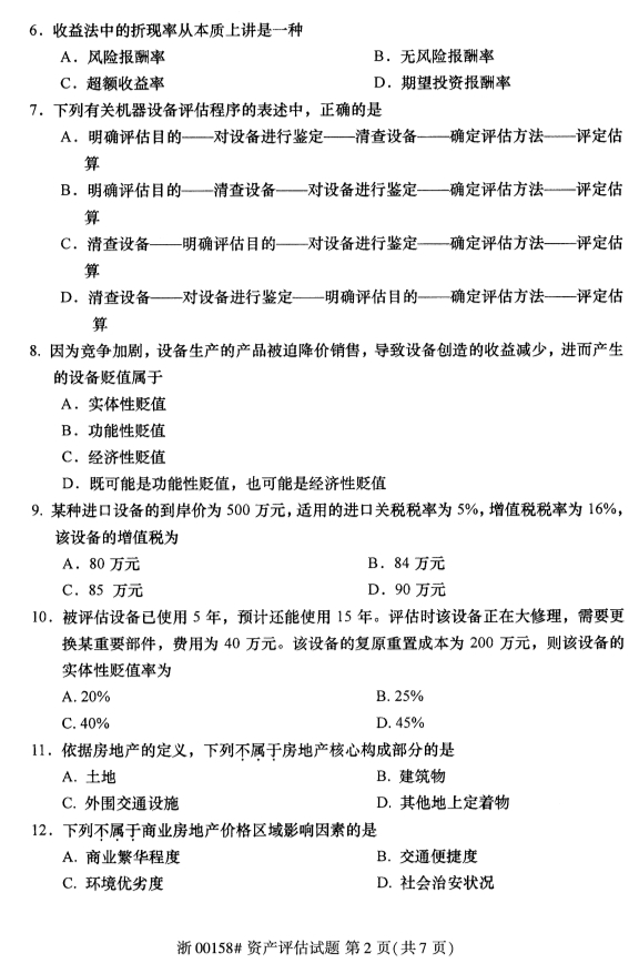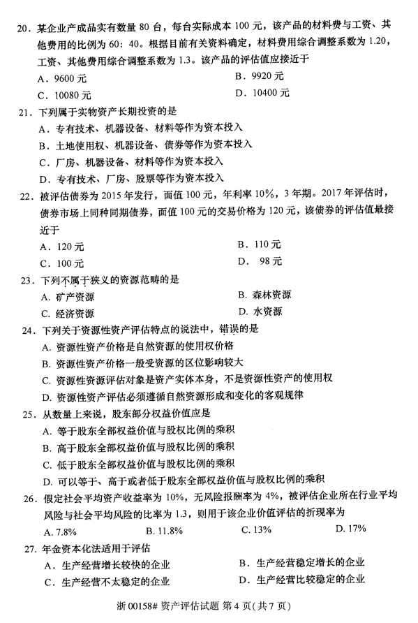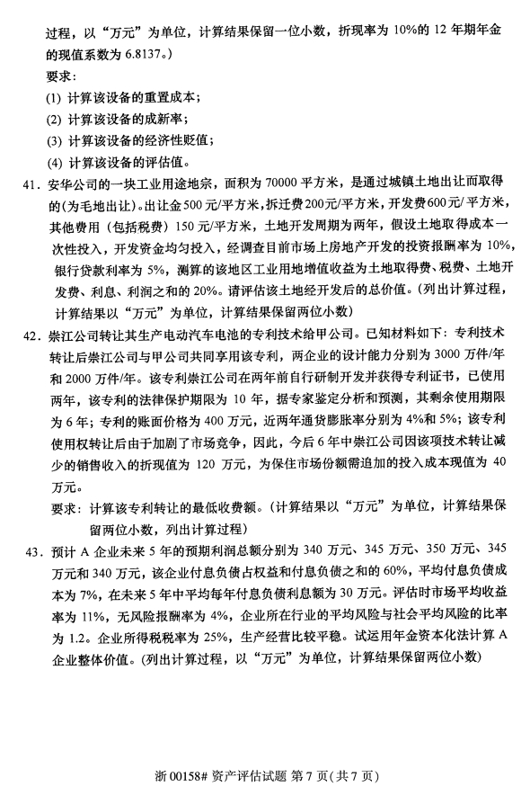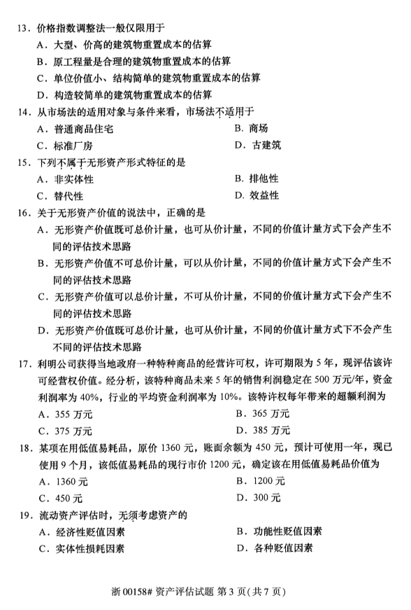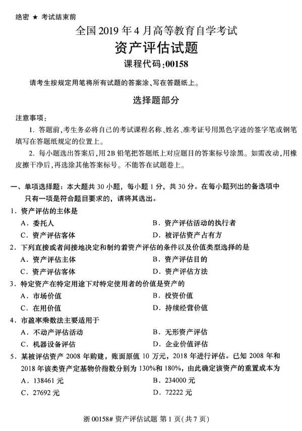 真题下载:浙江省2019年4月自考00158资产评估试题