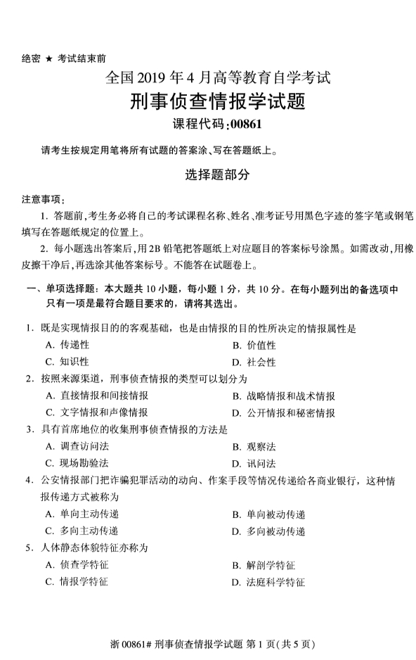 真题下载:全国2019年4月自考00861刑事侦查情报学概论试题.pdf