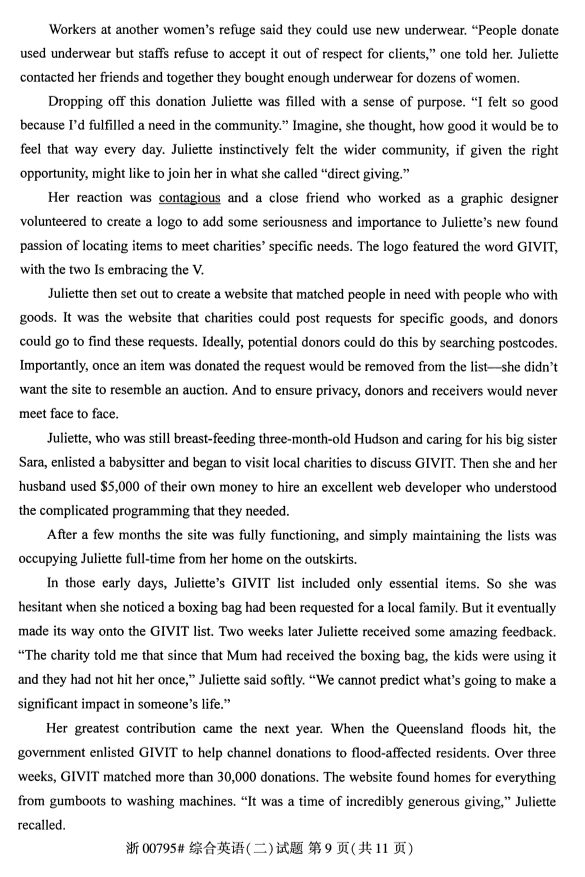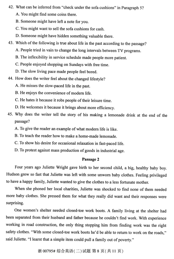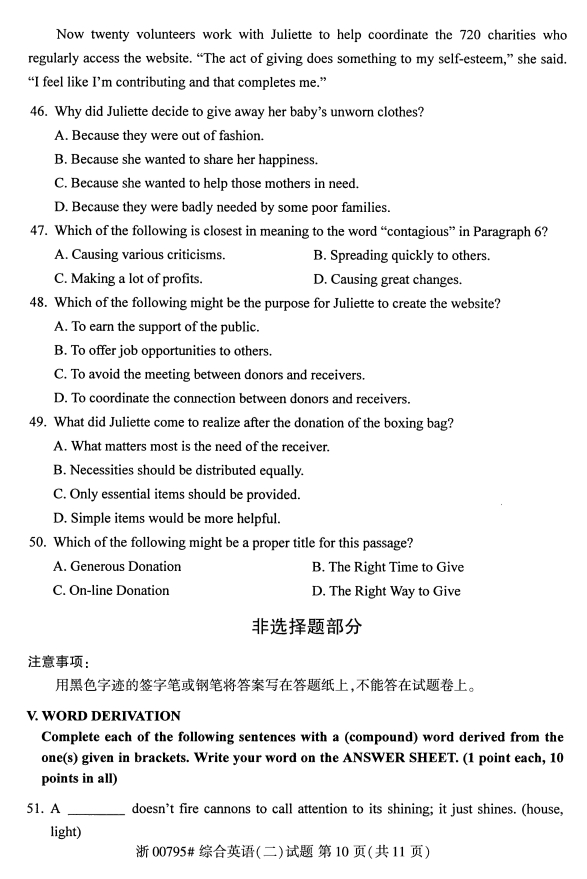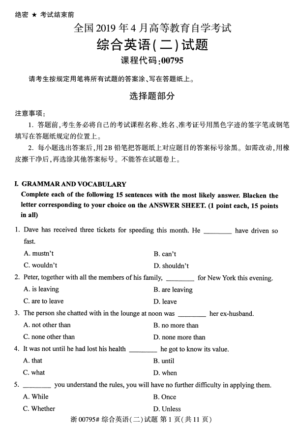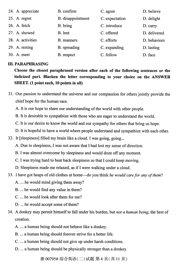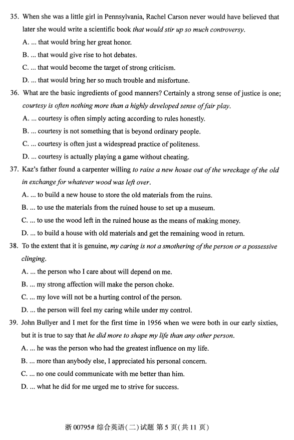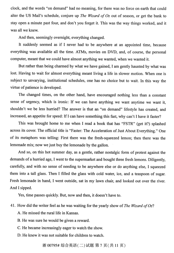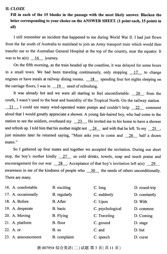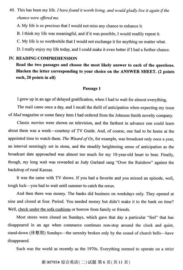 真题下载:浙江省2019年4月自考00795综合英语(二)试题