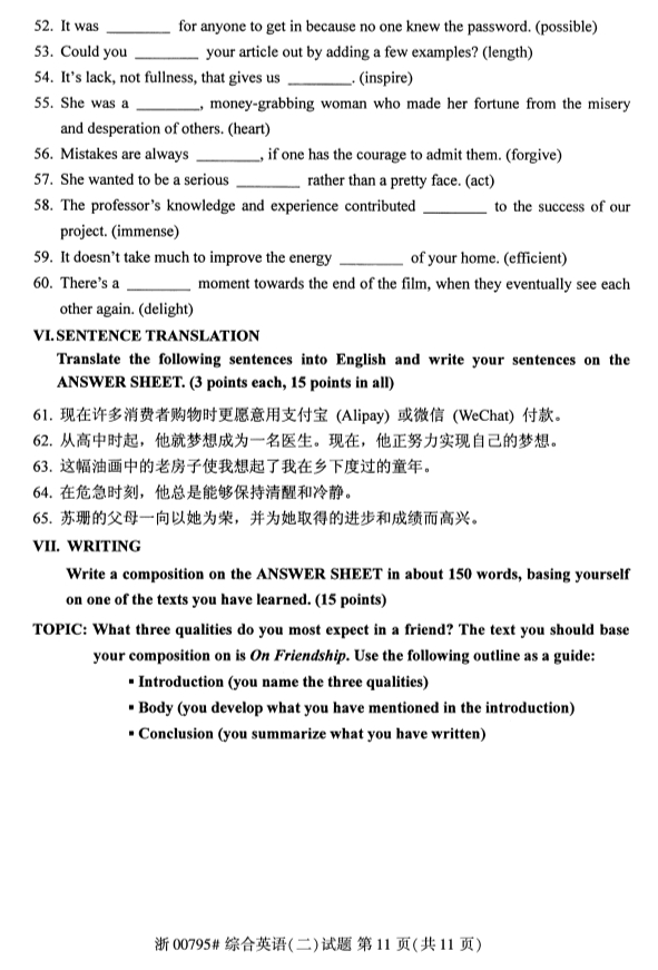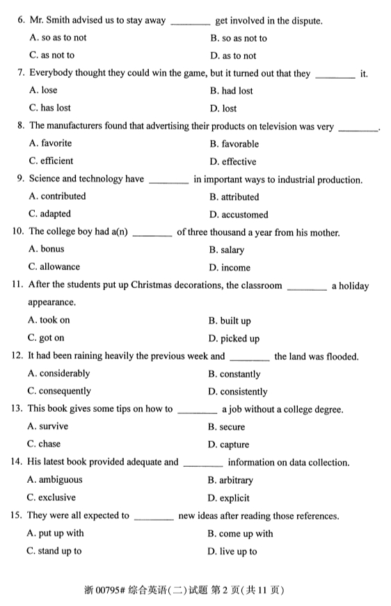 • 所在位置:浙江自考网 > 自考试卷 > 浙江省2019年4月自考00795综合英语(二)试题
