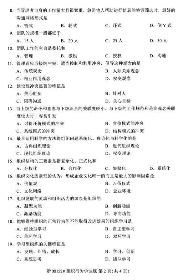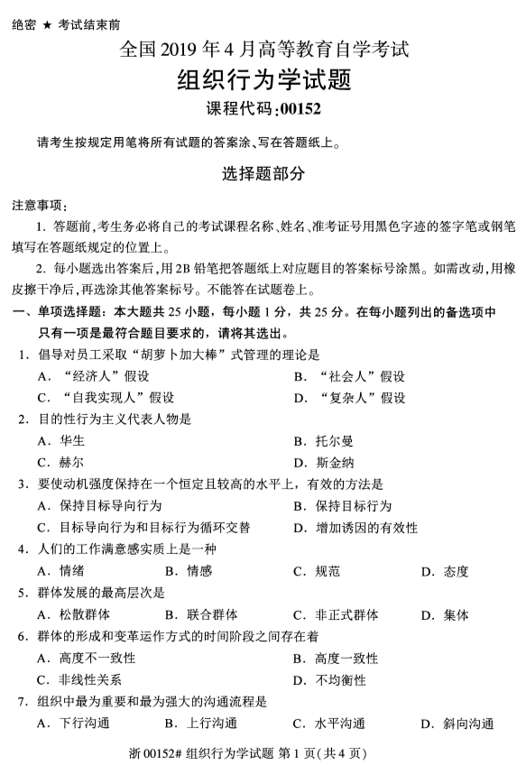 真题下载:浙江省2019年4月自考00152组织行为试题