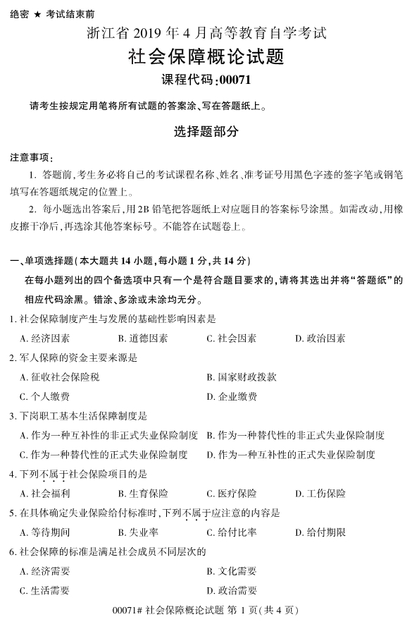 • 所在位置:浙江自考网 > 自考试卷 > 浙江省2019年4月自考00071社会保障概论试题