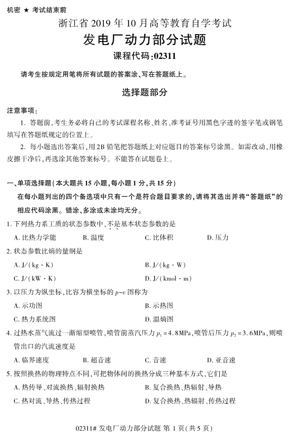 • 所在位置:浙江自考网 > 自考试卷 > 全国2019年10月自考02311发电厂动力部分试题