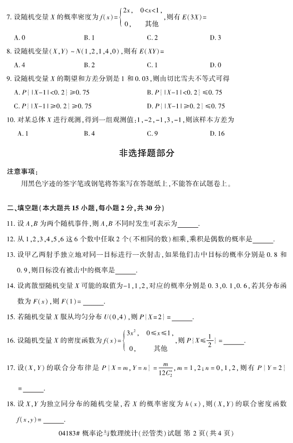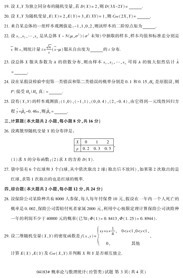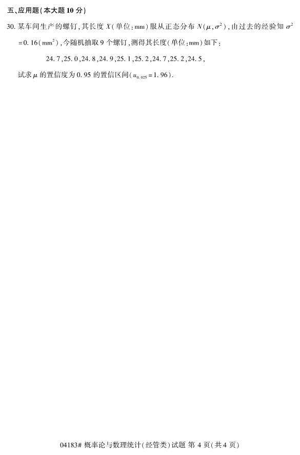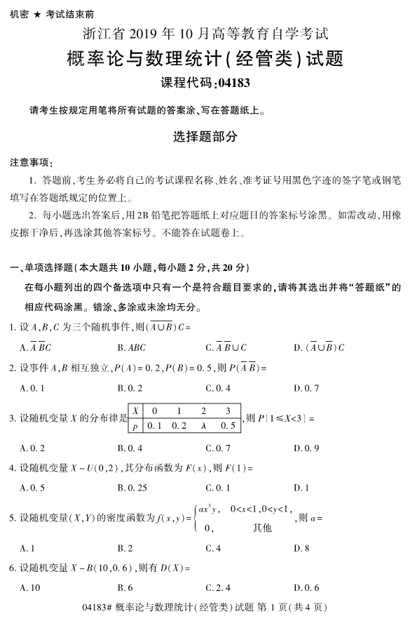全国2019年10月自考04183概率论与数理统计(经管类)试题