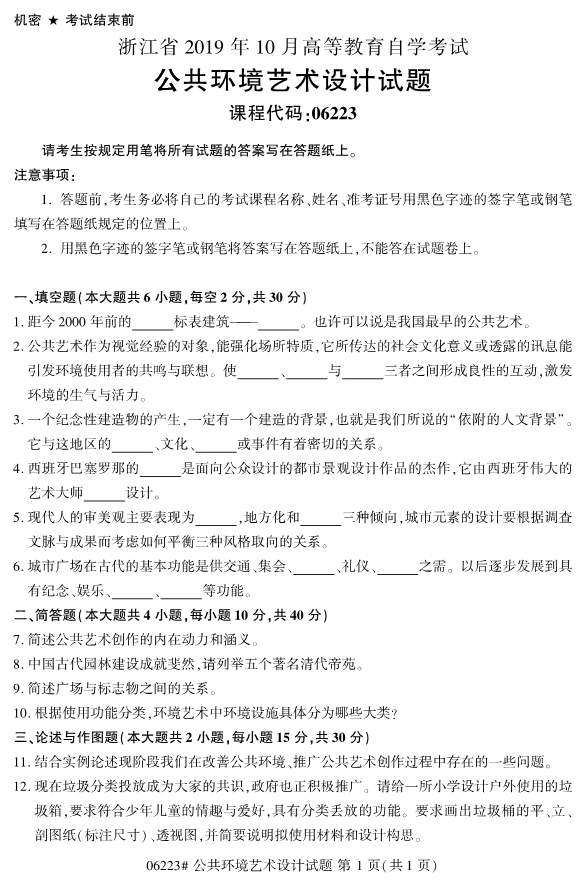 • 所在位置:浙江自考网 > 自考试卷 > 全国2019年10月自考06223公共环境艺术设计试题
