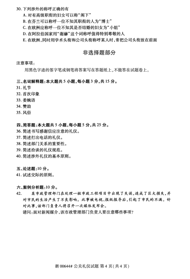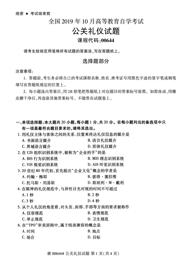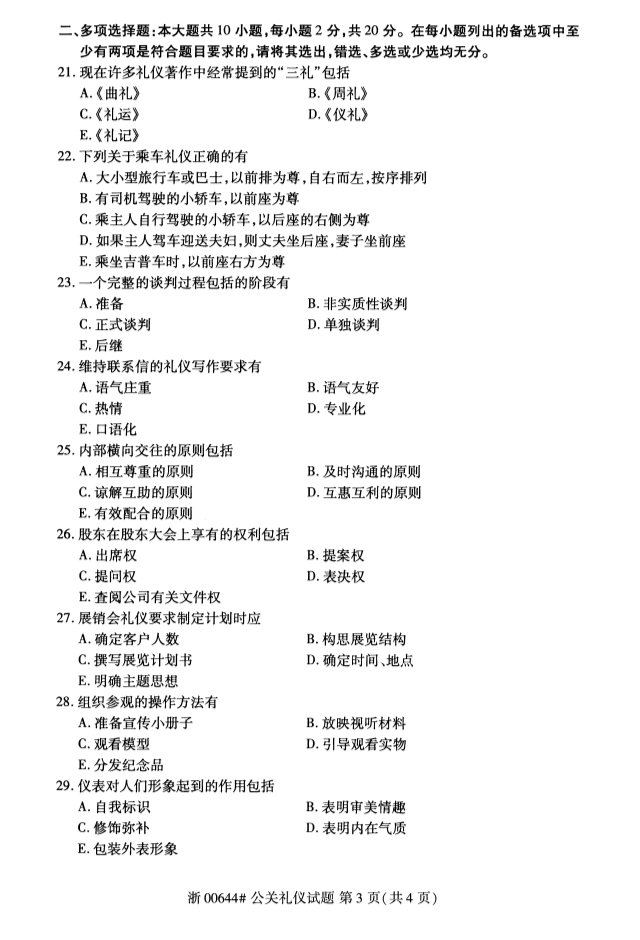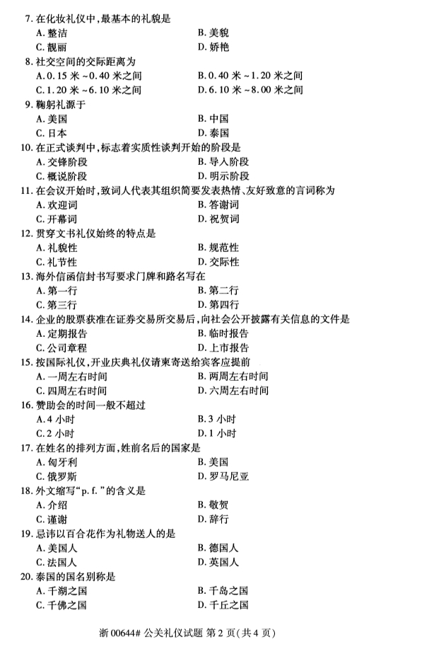 • 所在位置:浙江自考网 > 自考试卷 > 全国2019年10月自考00644公关礼仪试题