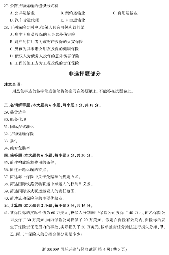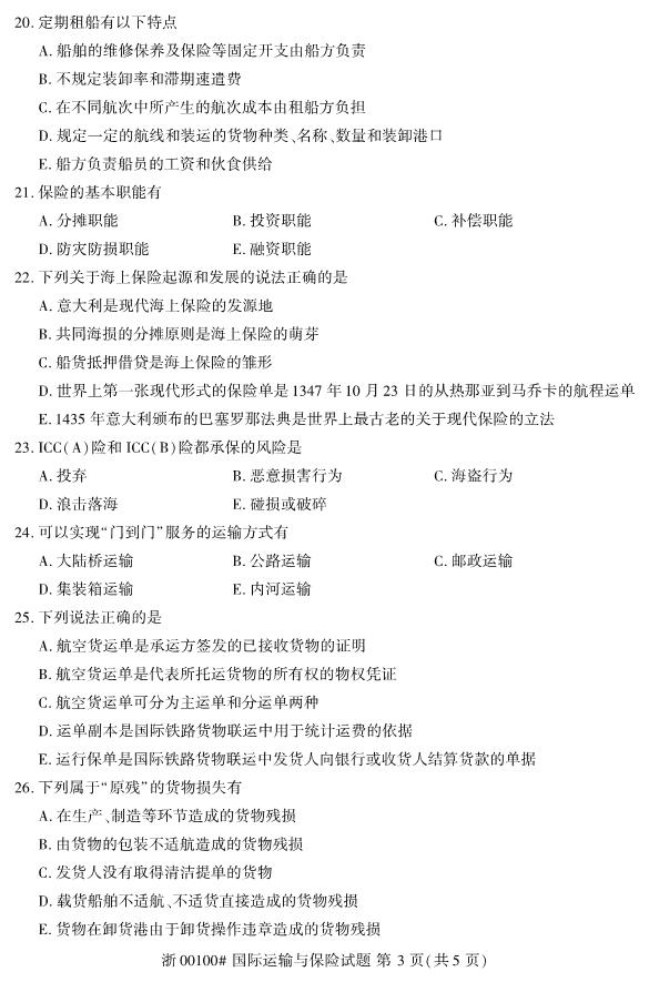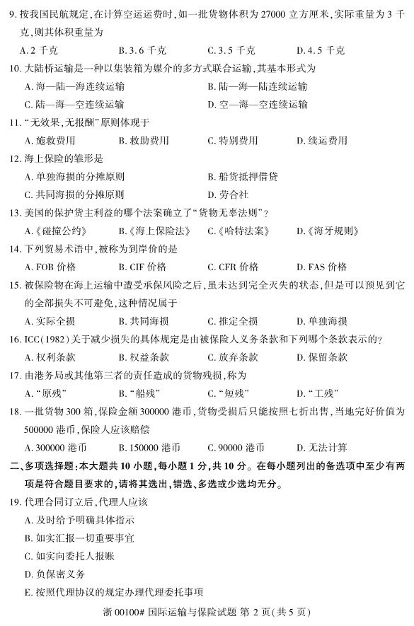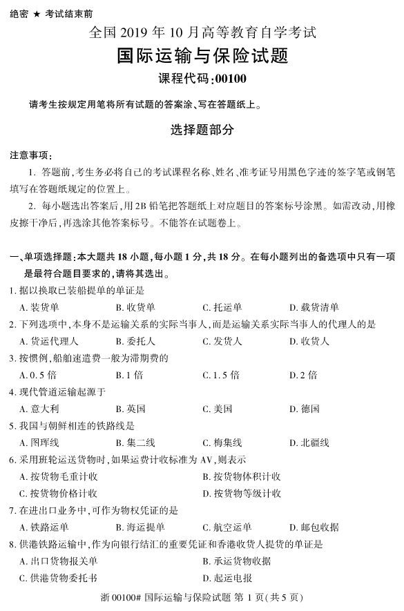 • 所在位置:浙江自考网 > 自考试卷 > 全国2019年10月自考00100国际运输与保险试题