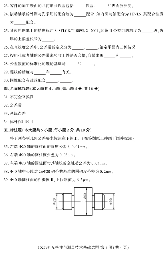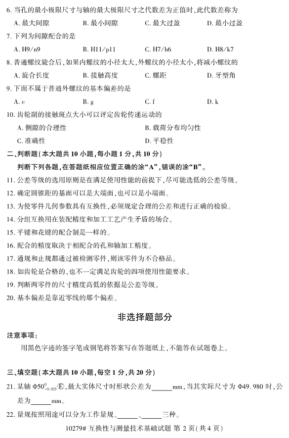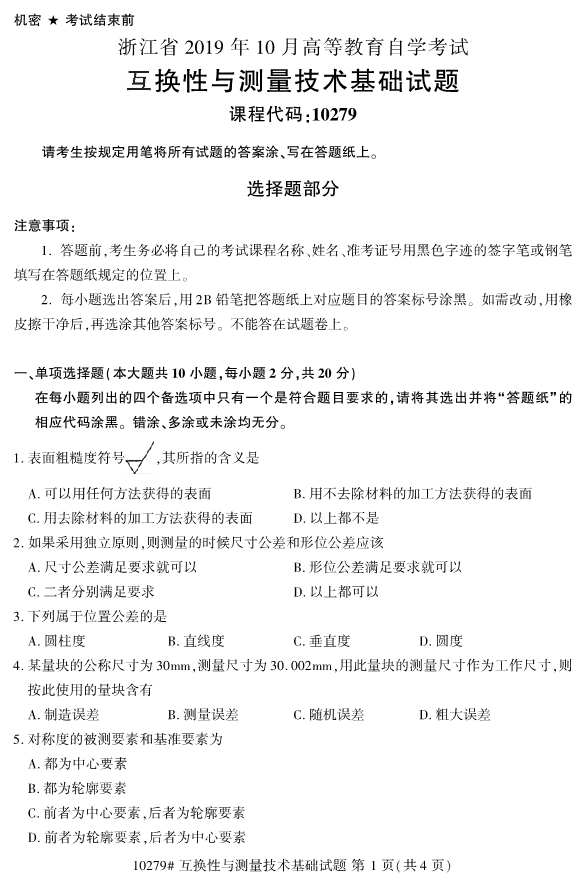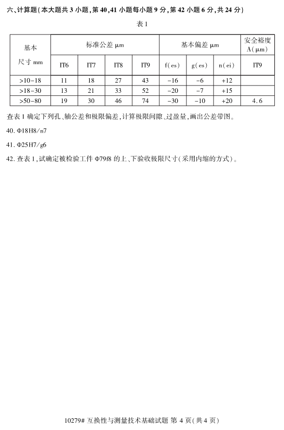 全国2019年10月自考10279互换性与测量技术基础试题