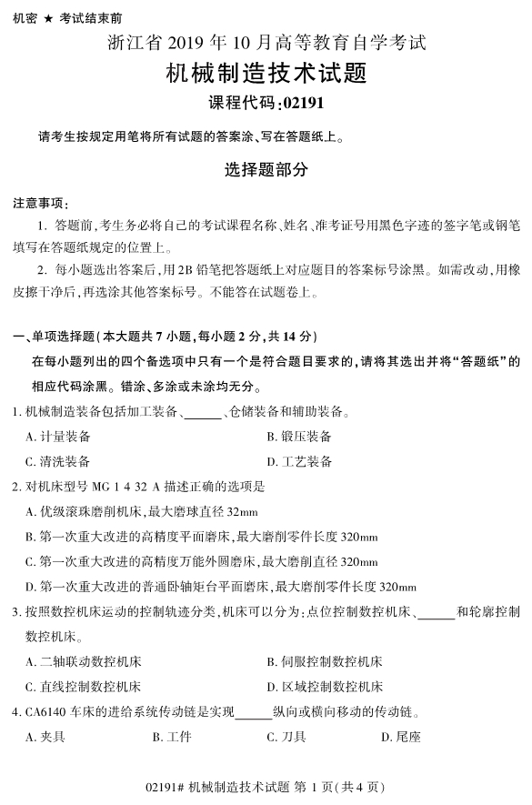 • 所在位置:浙江自考网 > 自考试卷 > 全国2019年10月自考02191机械制造技术试题