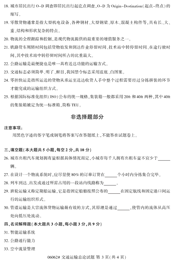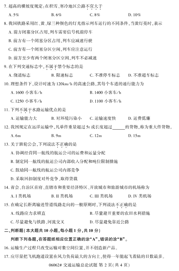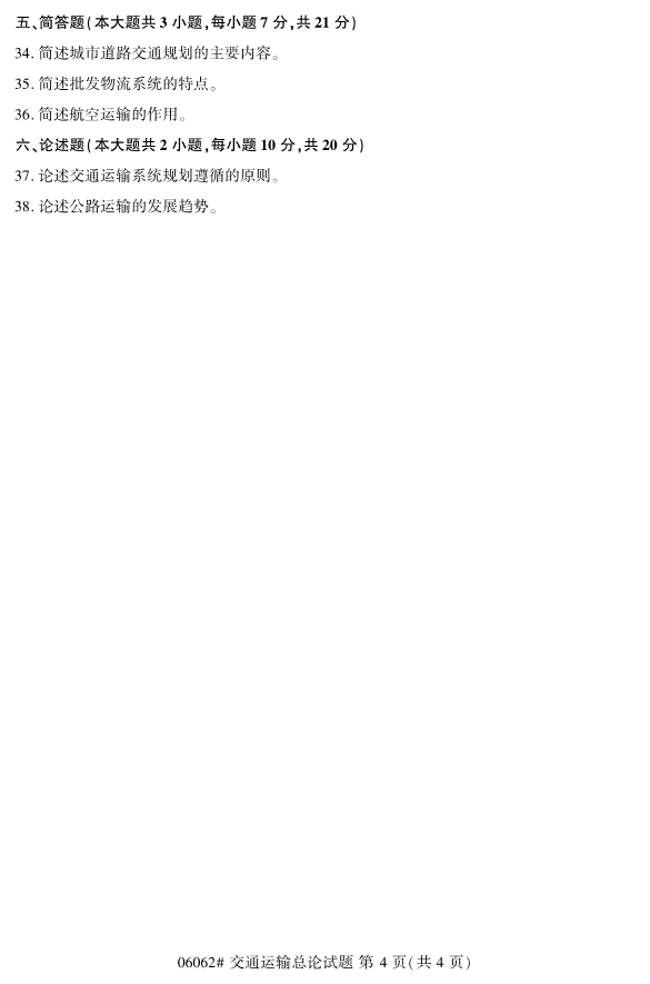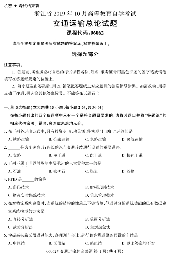 • 所在位置:浙江自考网 > 自考试卷 > 全国2019年10月自考06062交通运输总论试题