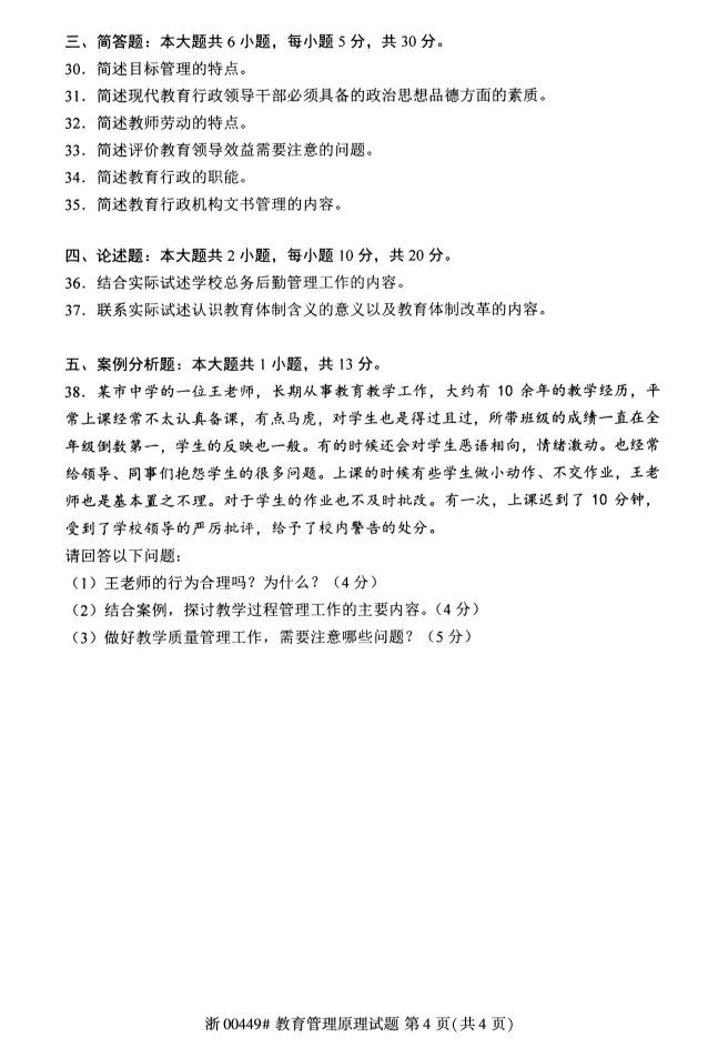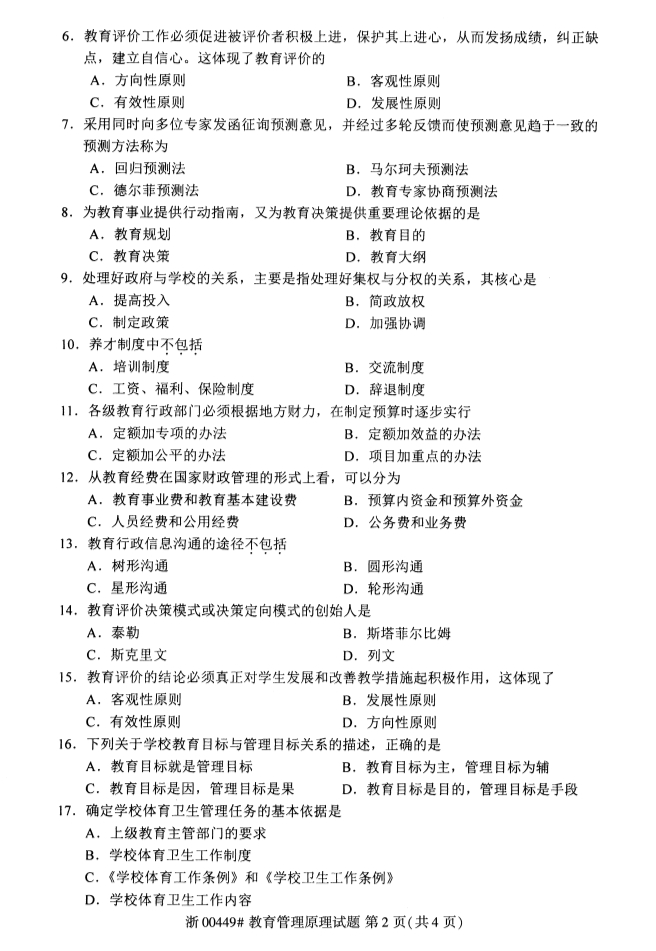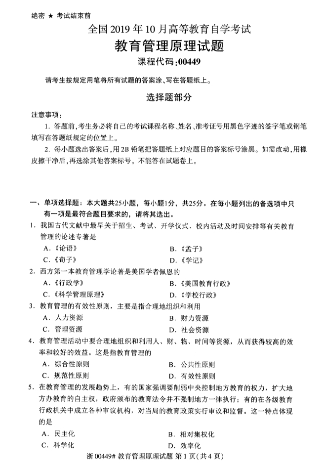 • 所在位置:浙江自考网 > 自考试卷 > 全国2019年10月自考00449教育管理原理试题