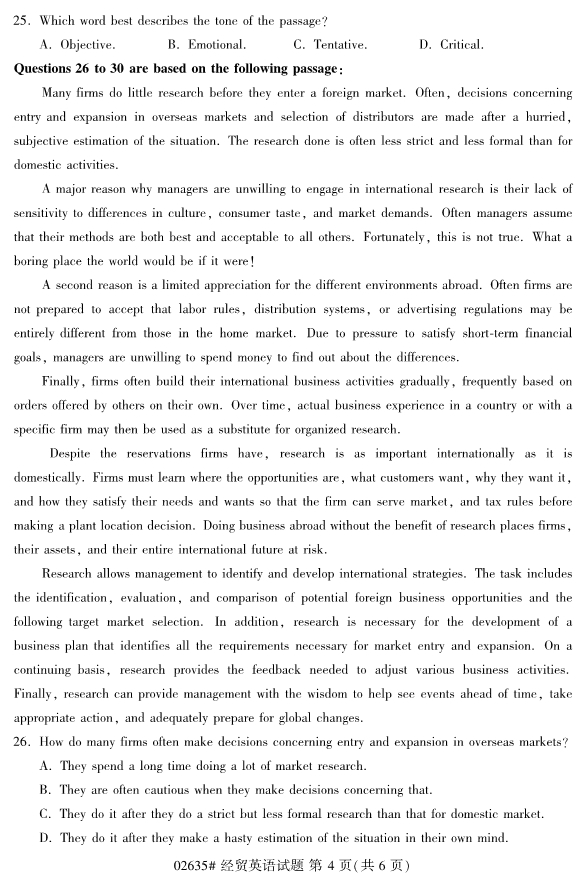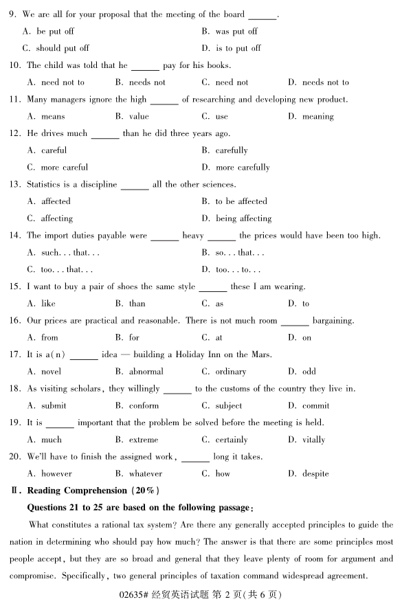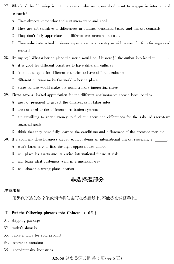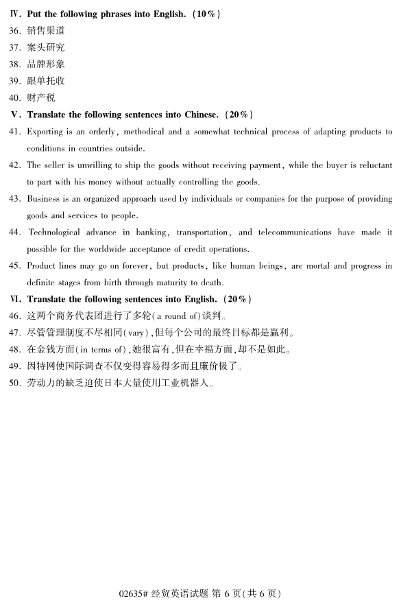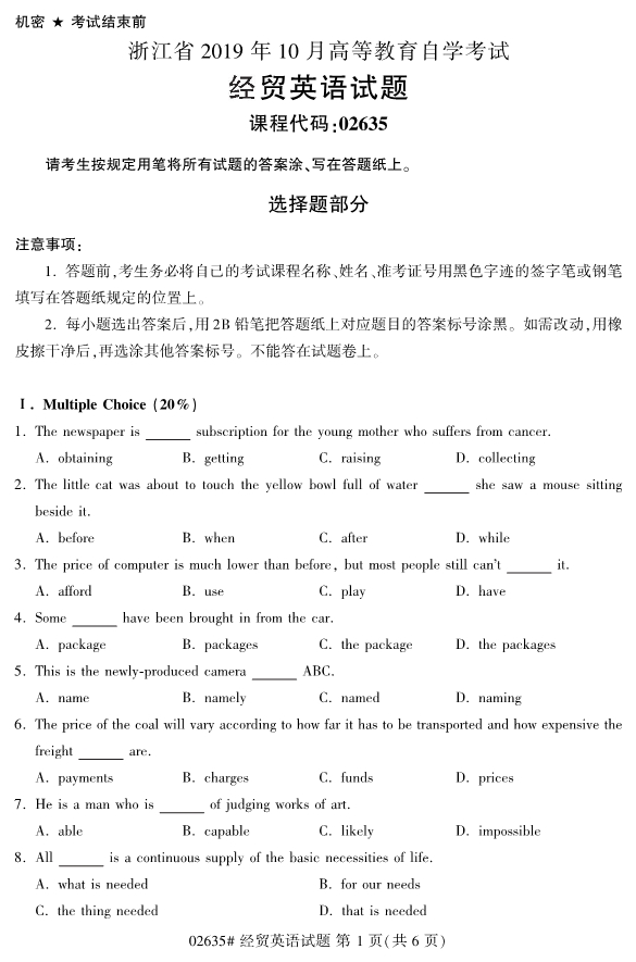 • 所在位置:浙江自考网 > 自考试卷 > 全国2019年10月自考02635经贸英语试题