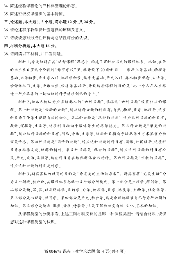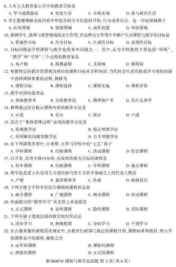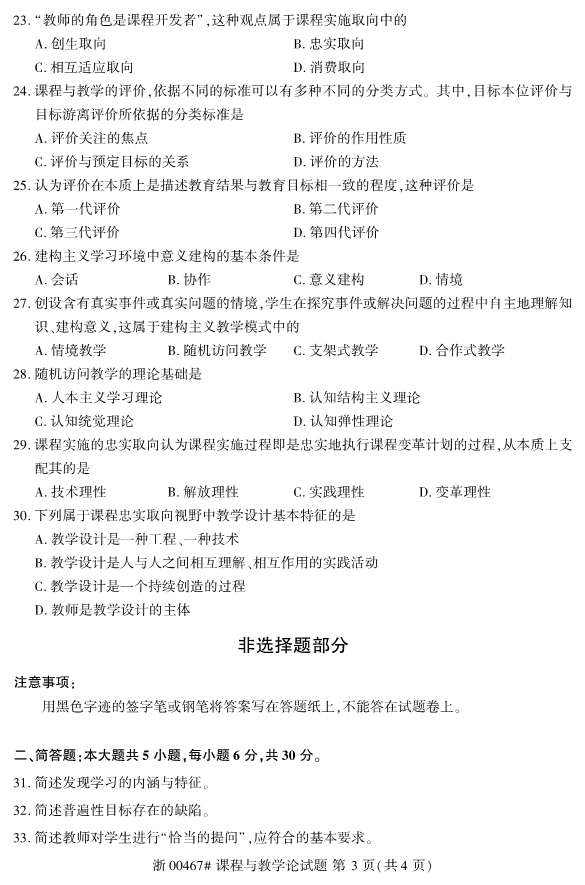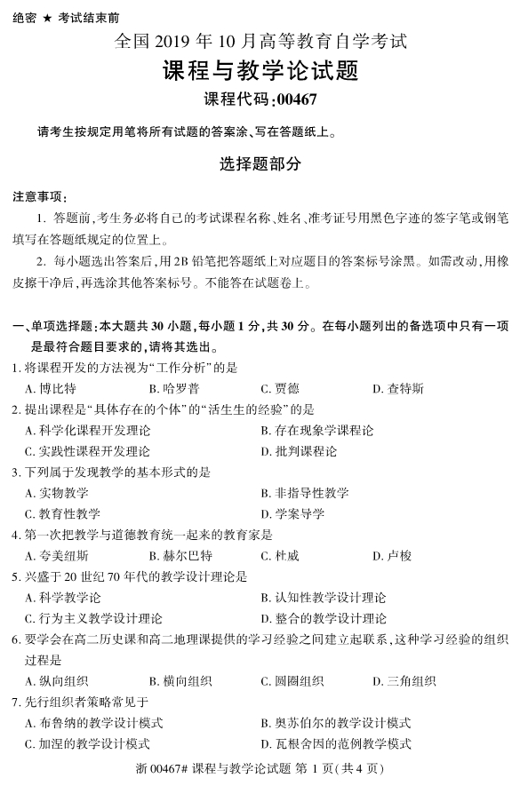 • 所在位置:浙江自考网 > 自考试卷 > 全国2019年10月自考00467课程与教学论试题