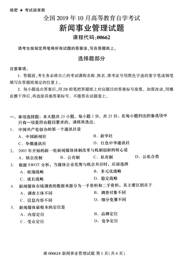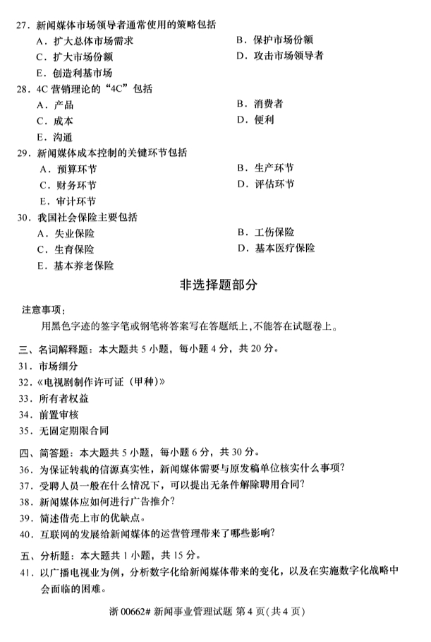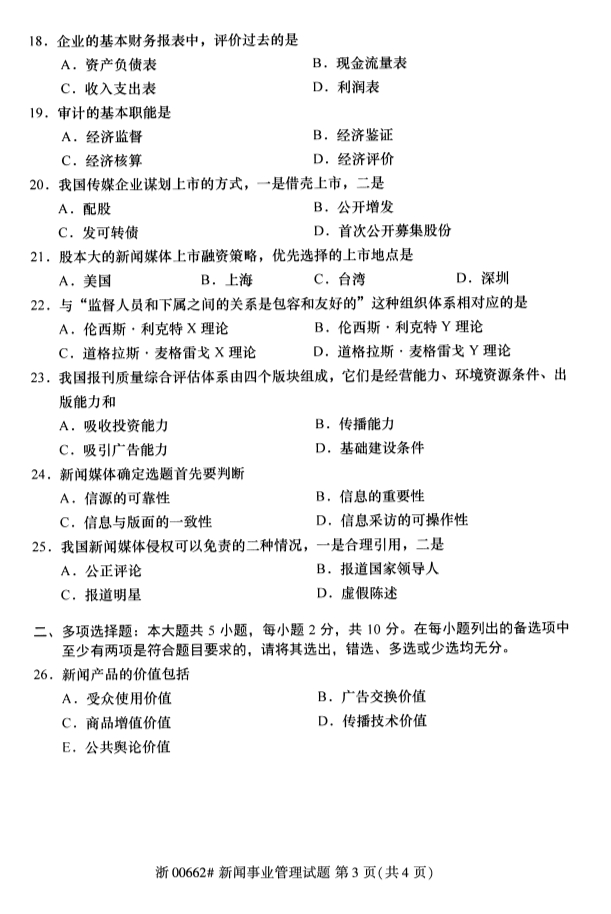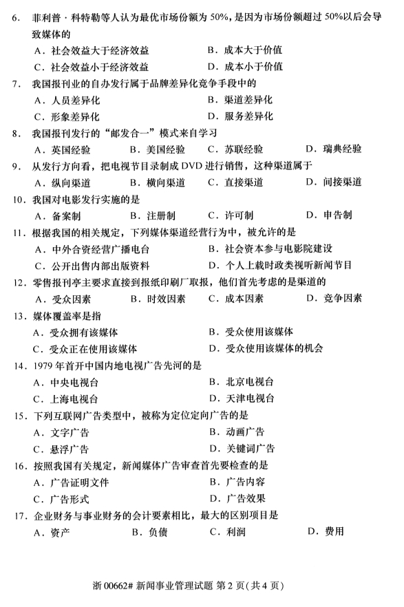 • 所在位置:浙江自考网 > 自考试卷 > 全国2019年10月自考00662新闻事业管理试题