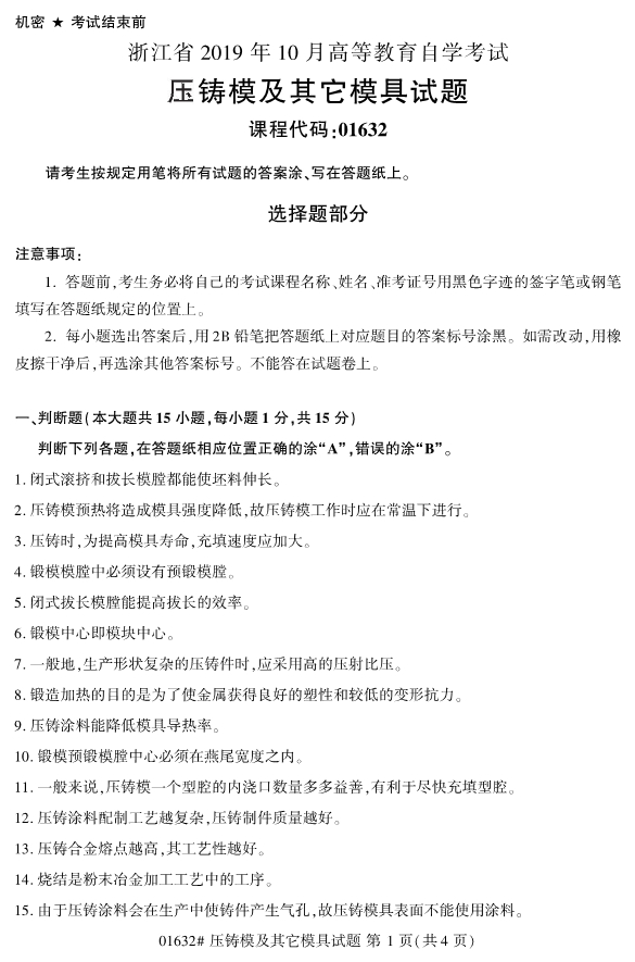 • 所在位置:浙江自考网 > 自考试卷 > 全国2019年10月自考01632压铸模及其它模具试题
