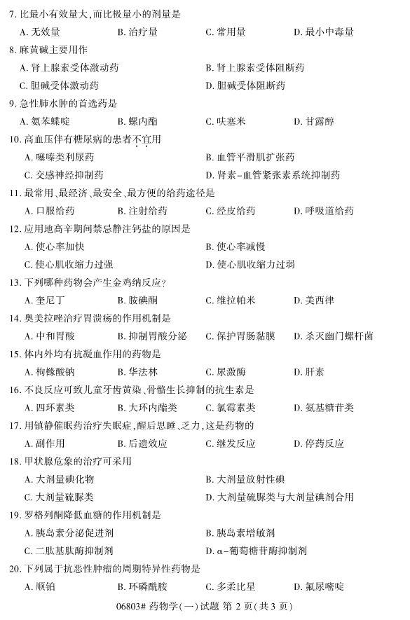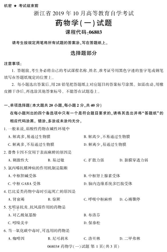 • 所在位置:浙江自考网 > 自考试卷 > 全国2019年10月自考06803药物学(一)试题