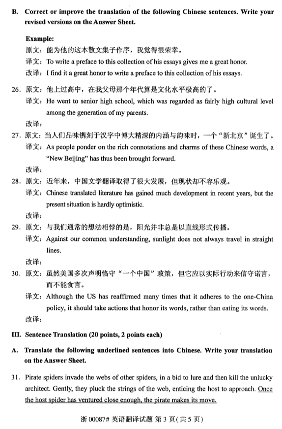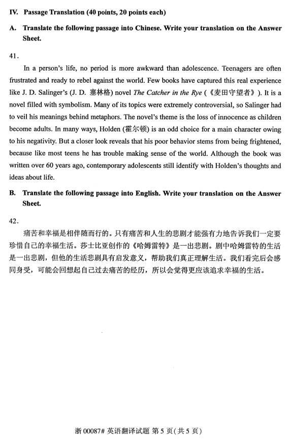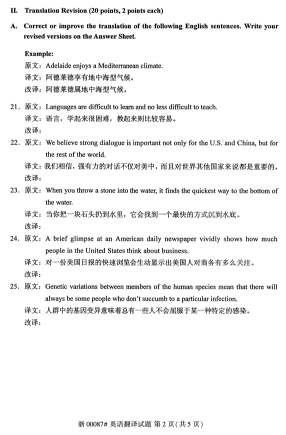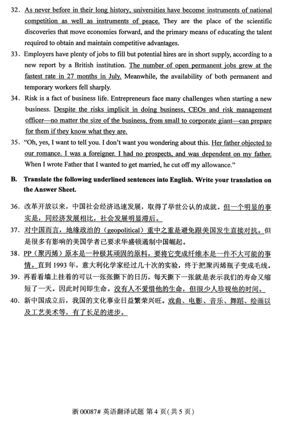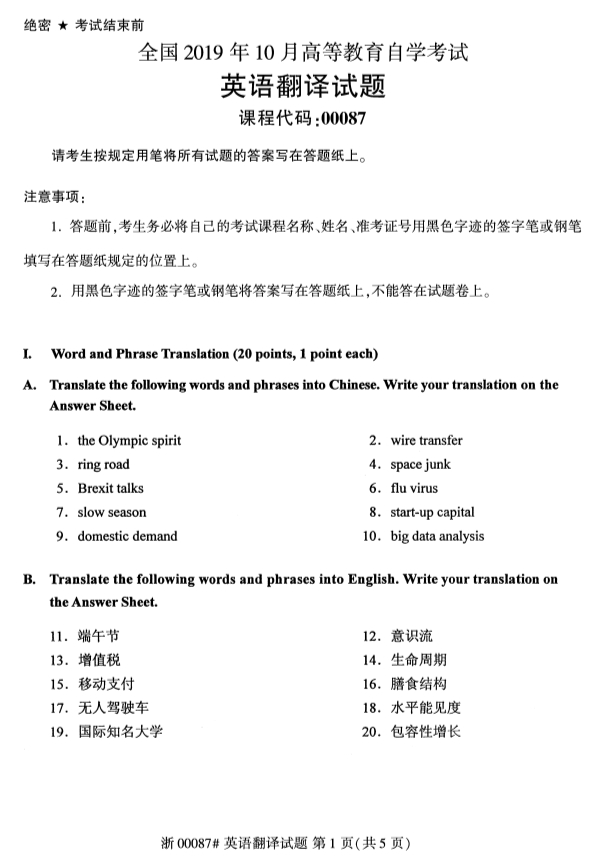 • 所在位置:浙江自考网 > 自考试卷 > 全国2019年10月自考00087英语翻译试题