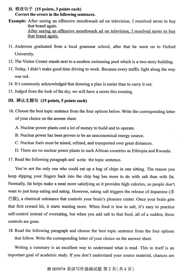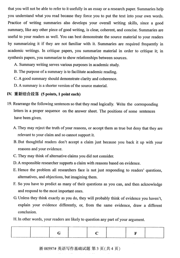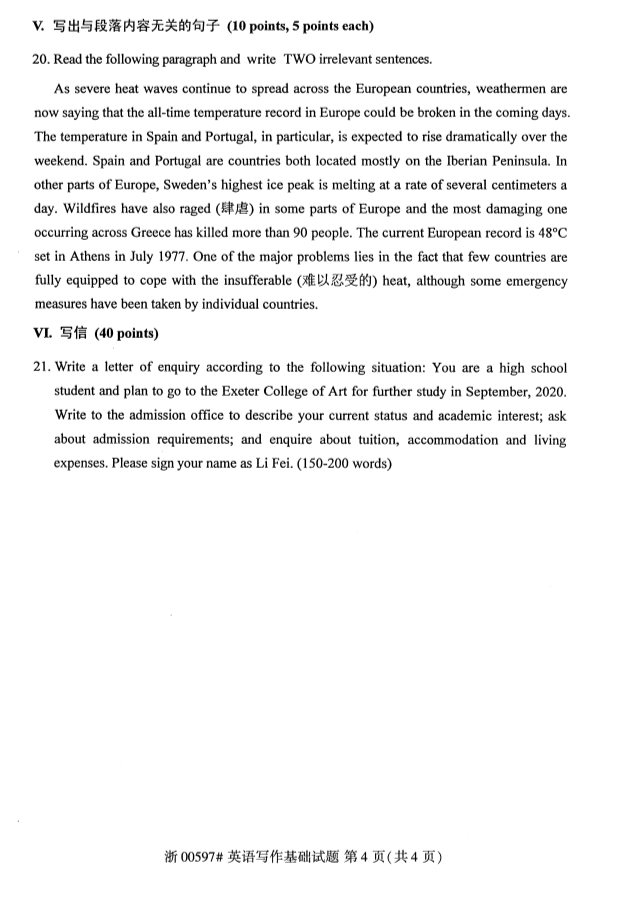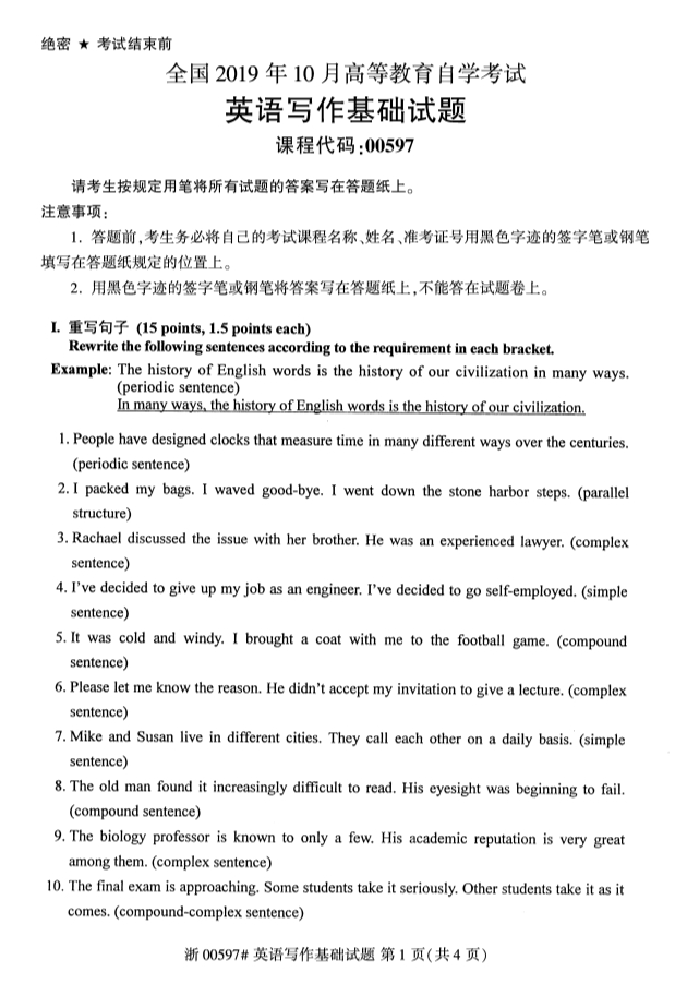 • 所在位置:浙江自考网 > 自考试卷 > 全国2019年10月自考00597英语写作基础试题