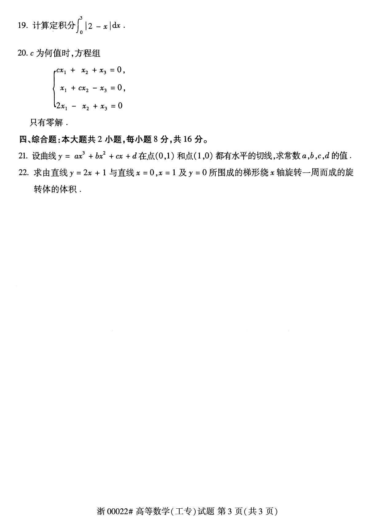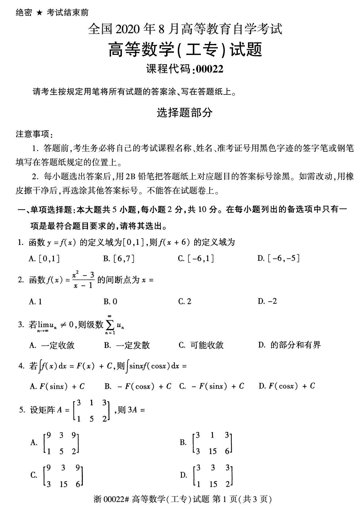 全国2020年8月自学考试00022高等数学(工专)概论试题