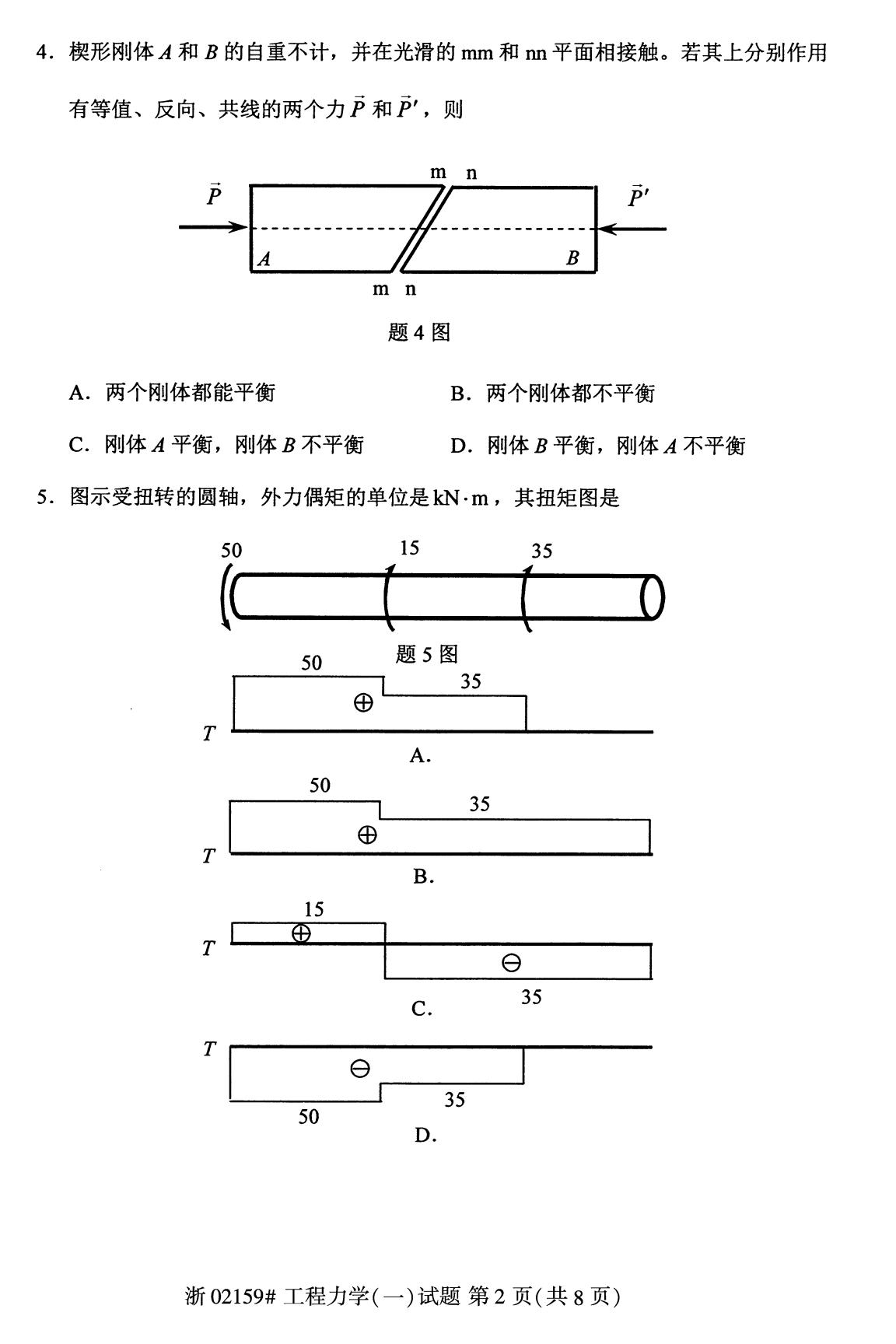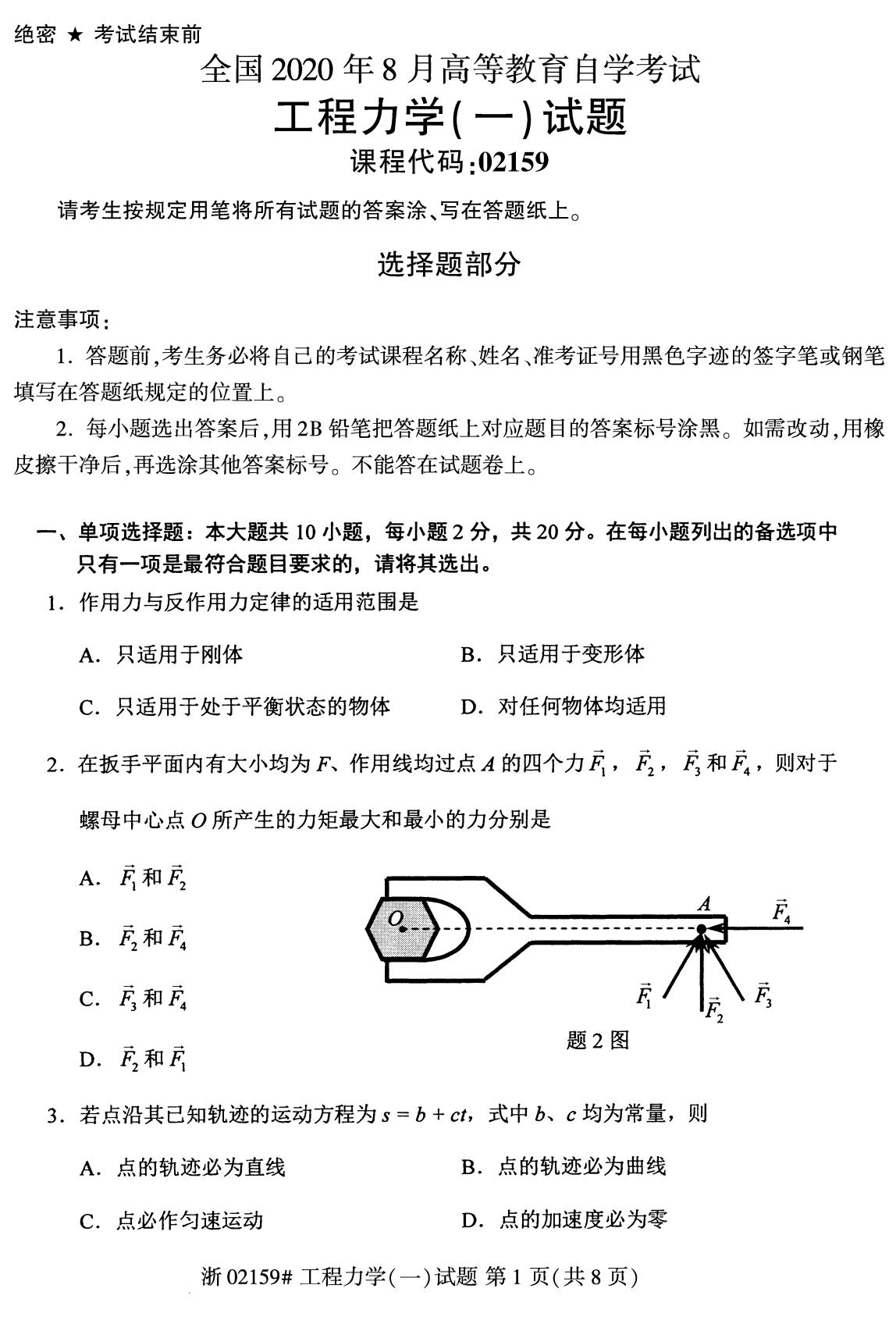 全国2020年8月自学考试02159工程力学(一)试题