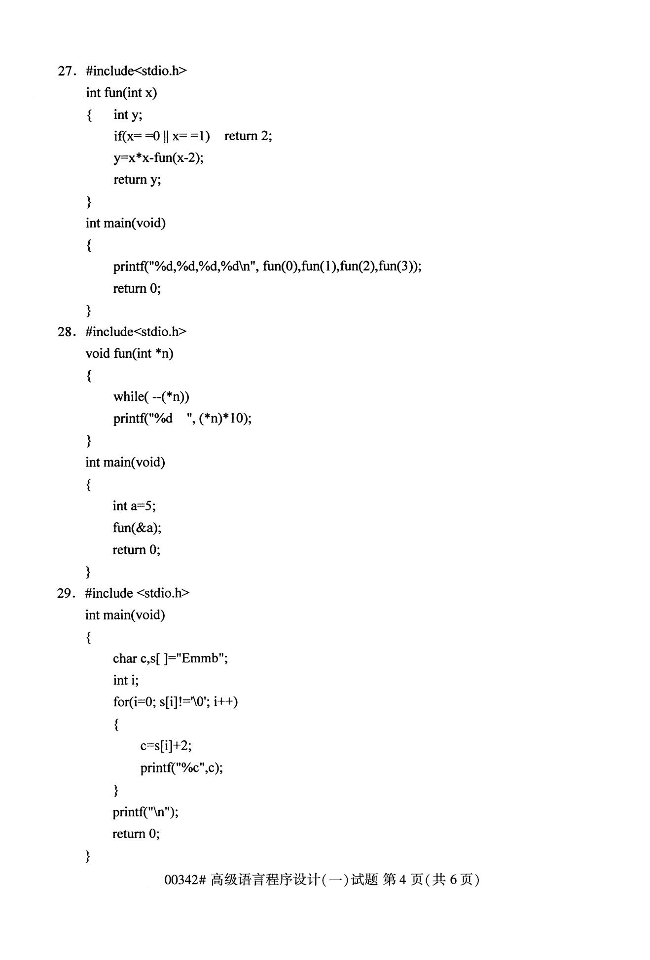 全国2020年10月自学考试00342高级语言程序设计(一)试题