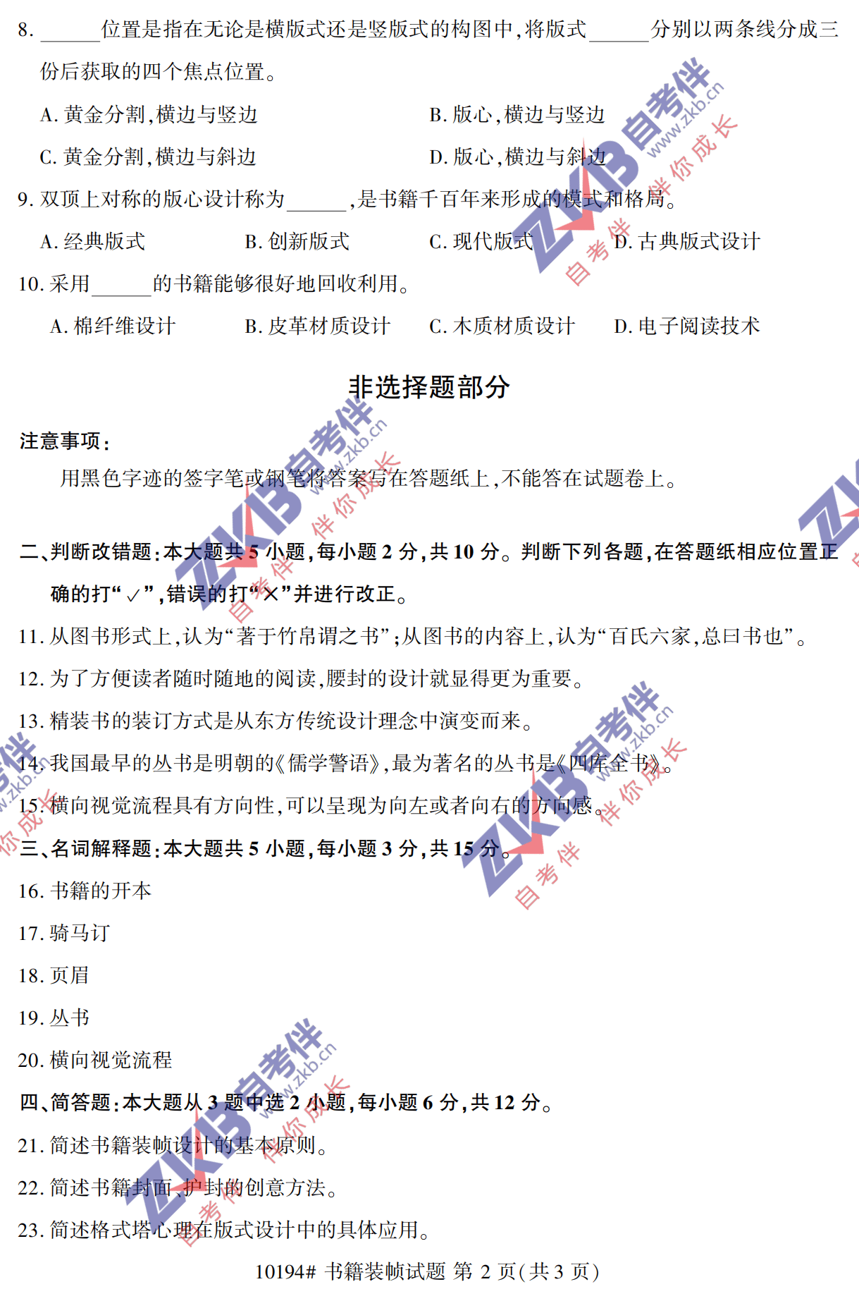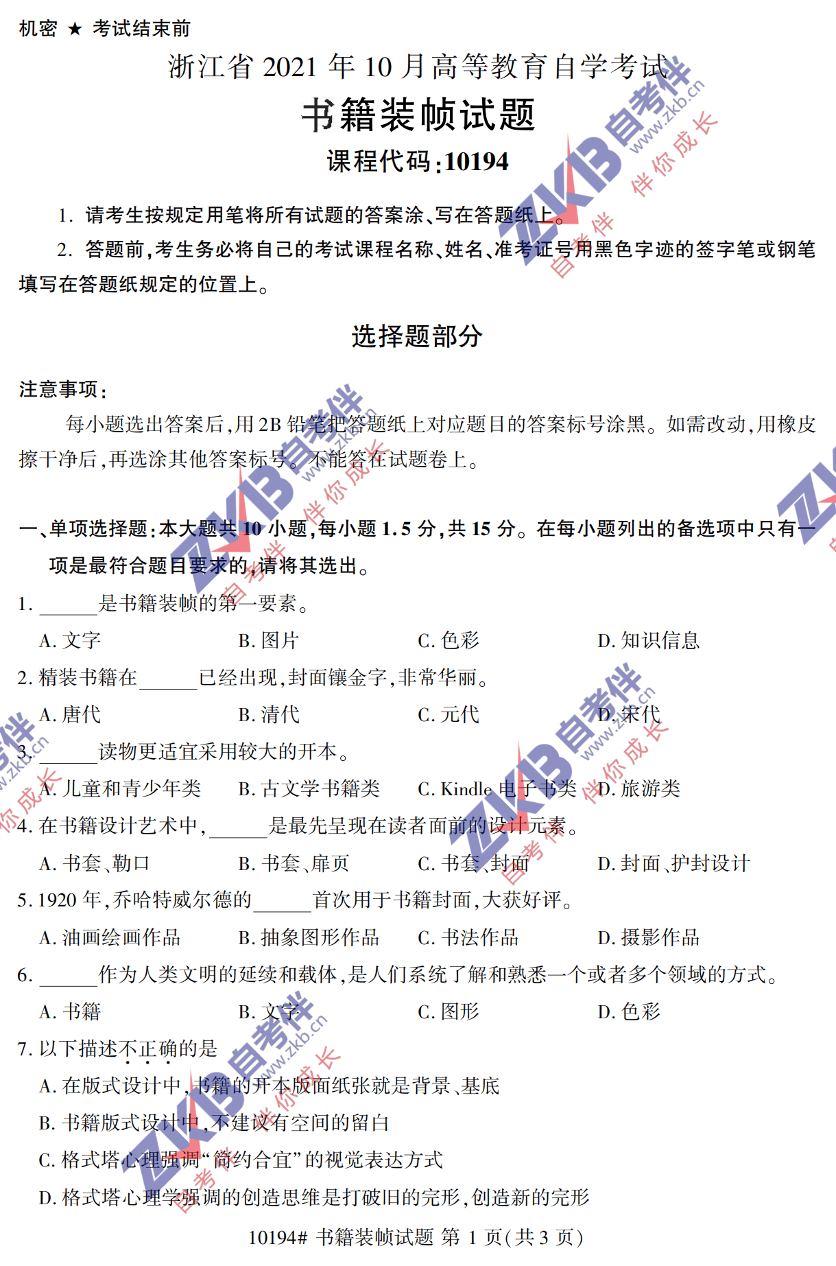 • 所在位置:浙江自考网 > 自考试卷 > 全国2021年10月自考《书籍装帧》真题试卷