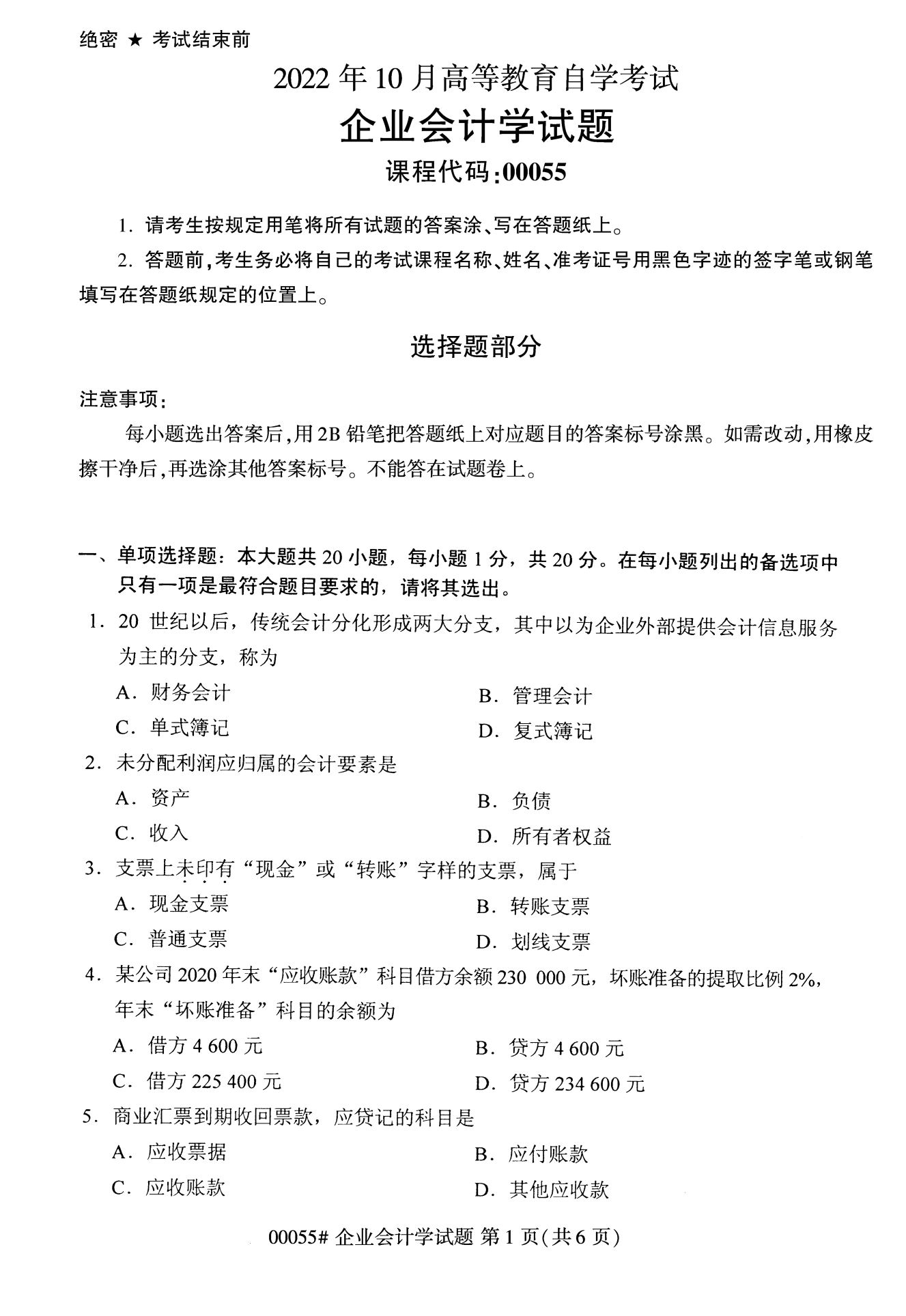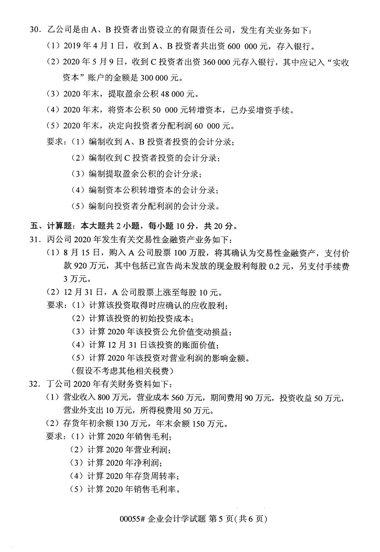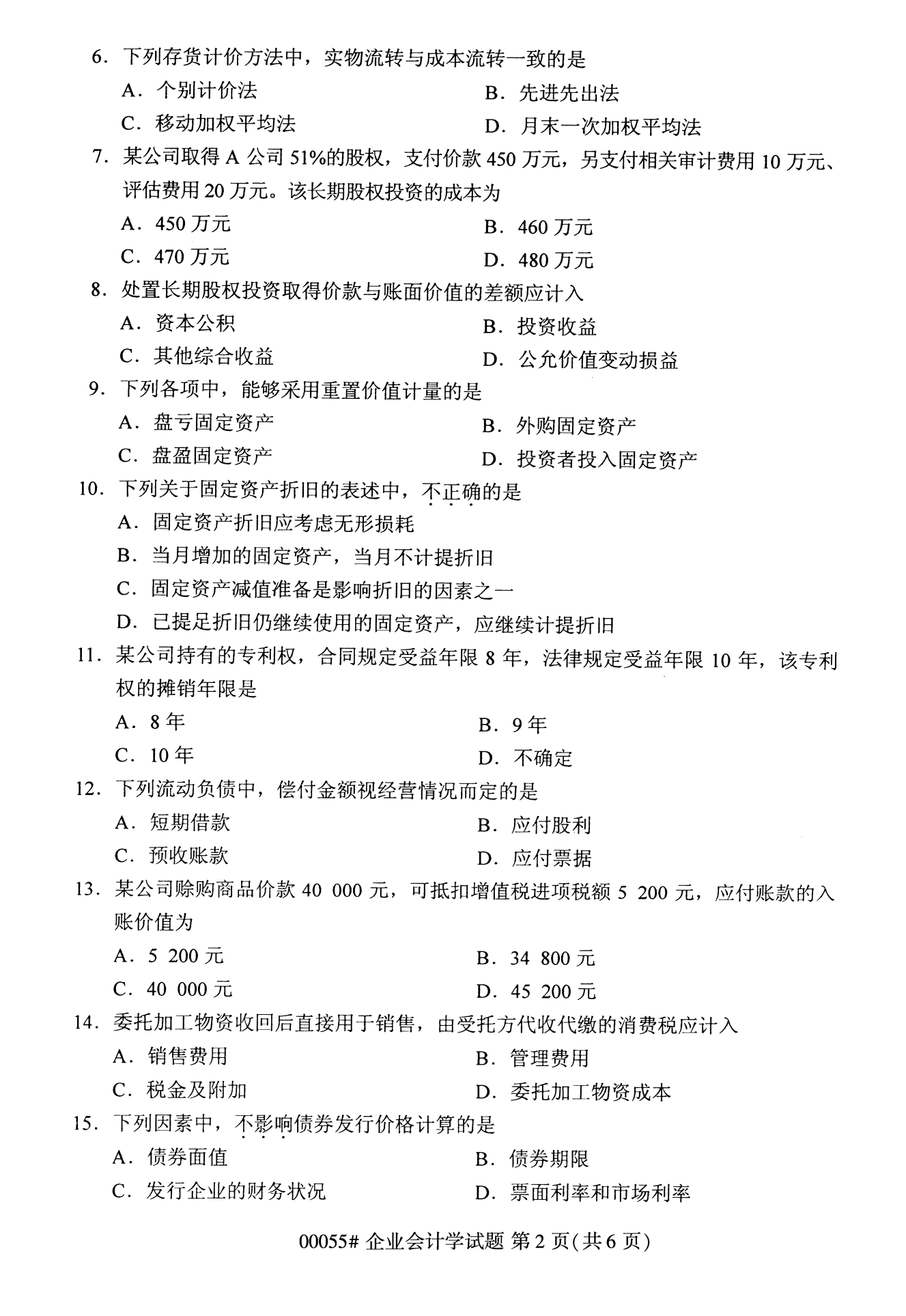 2022年10月浙江自考00055企业会计学试题