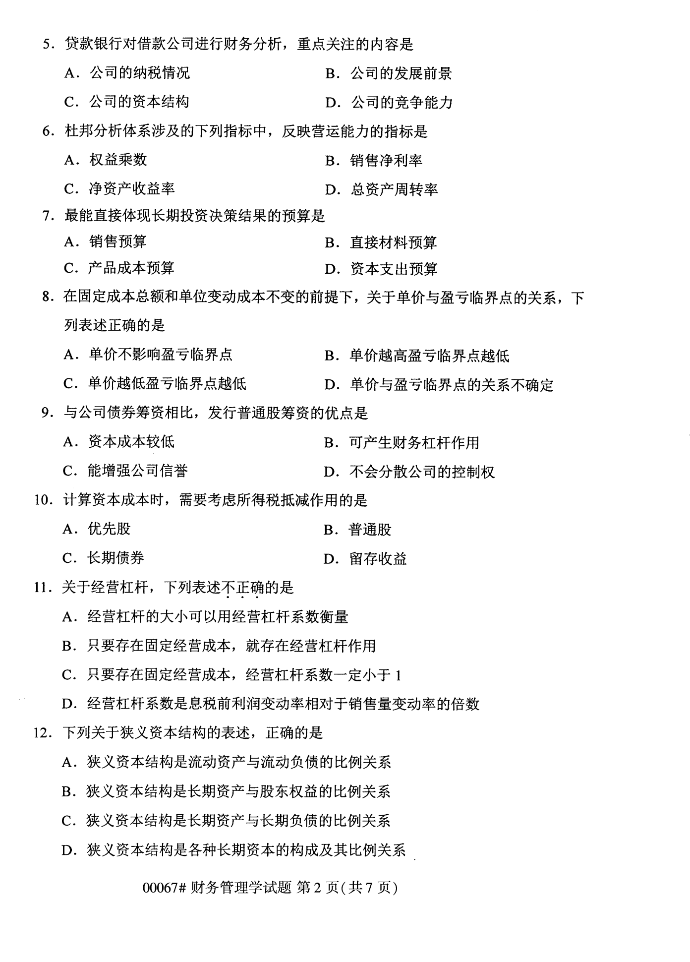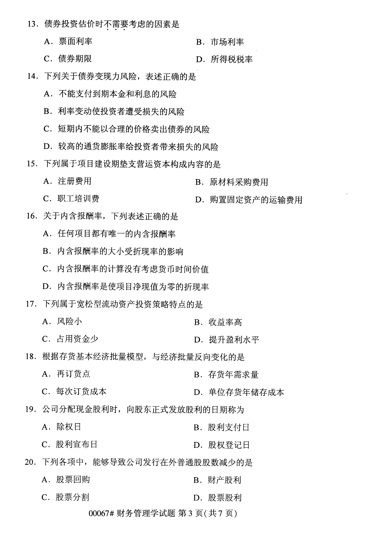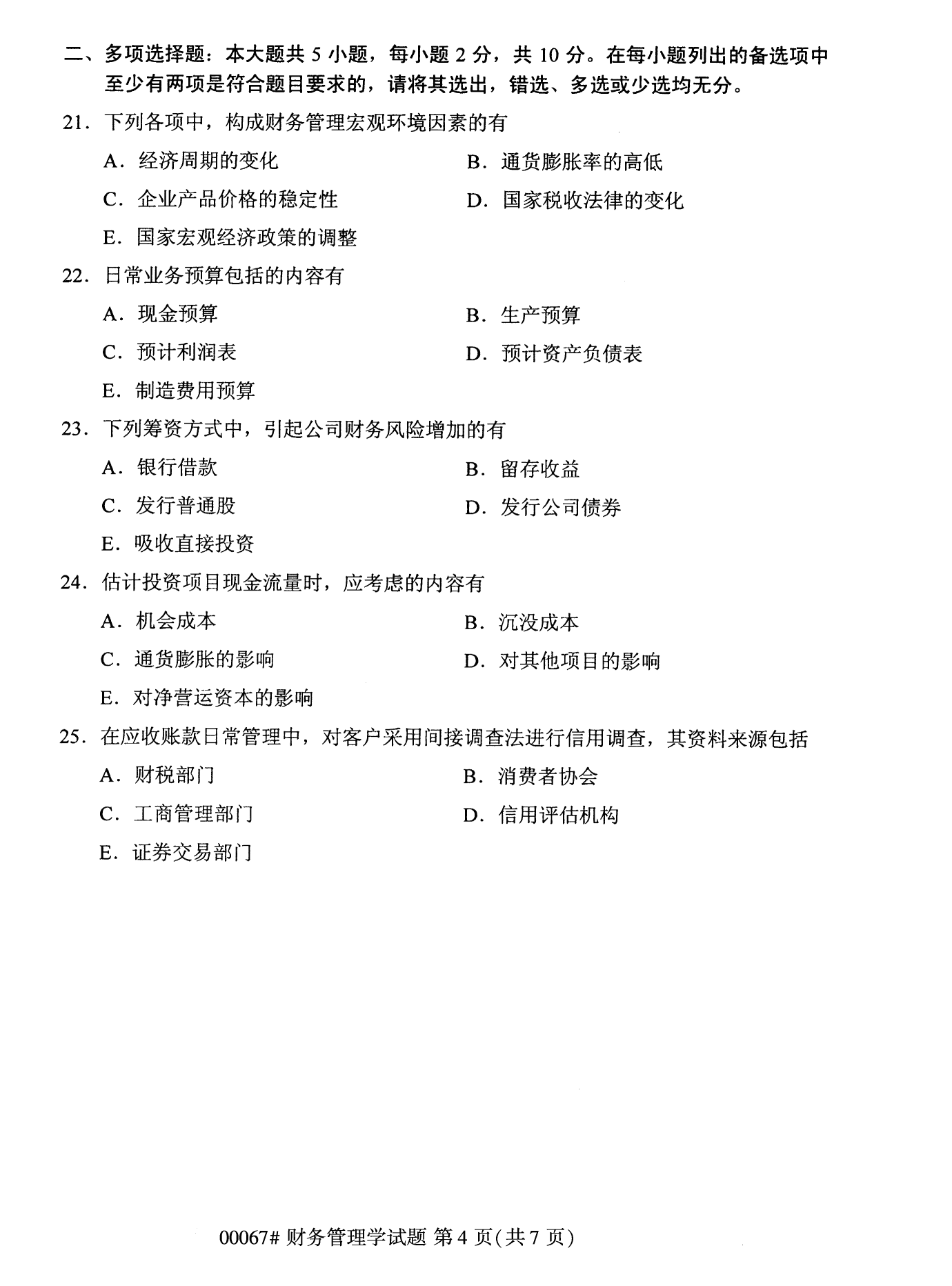 - 2024年10月浙江自考00067财务管理学试题 12-20