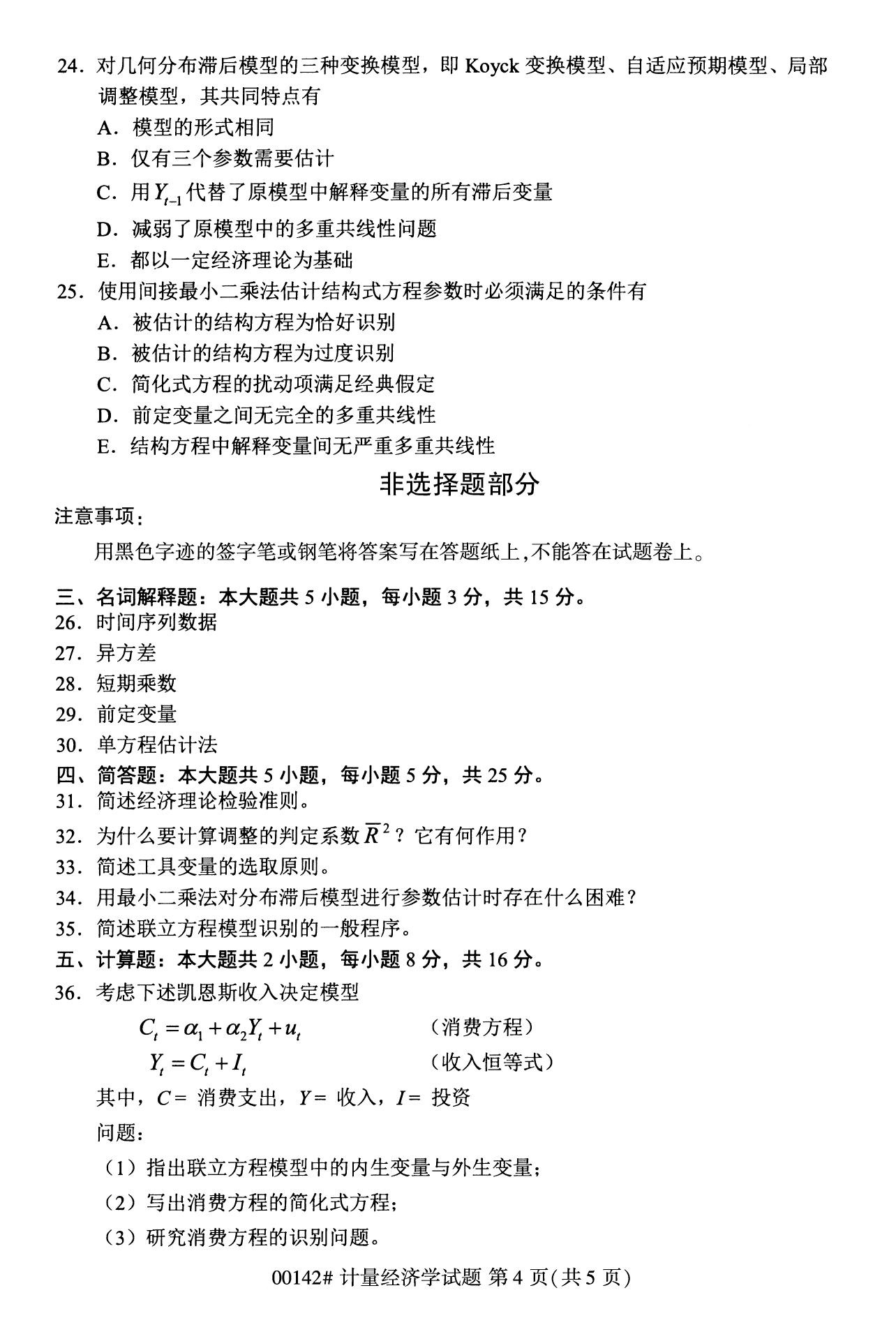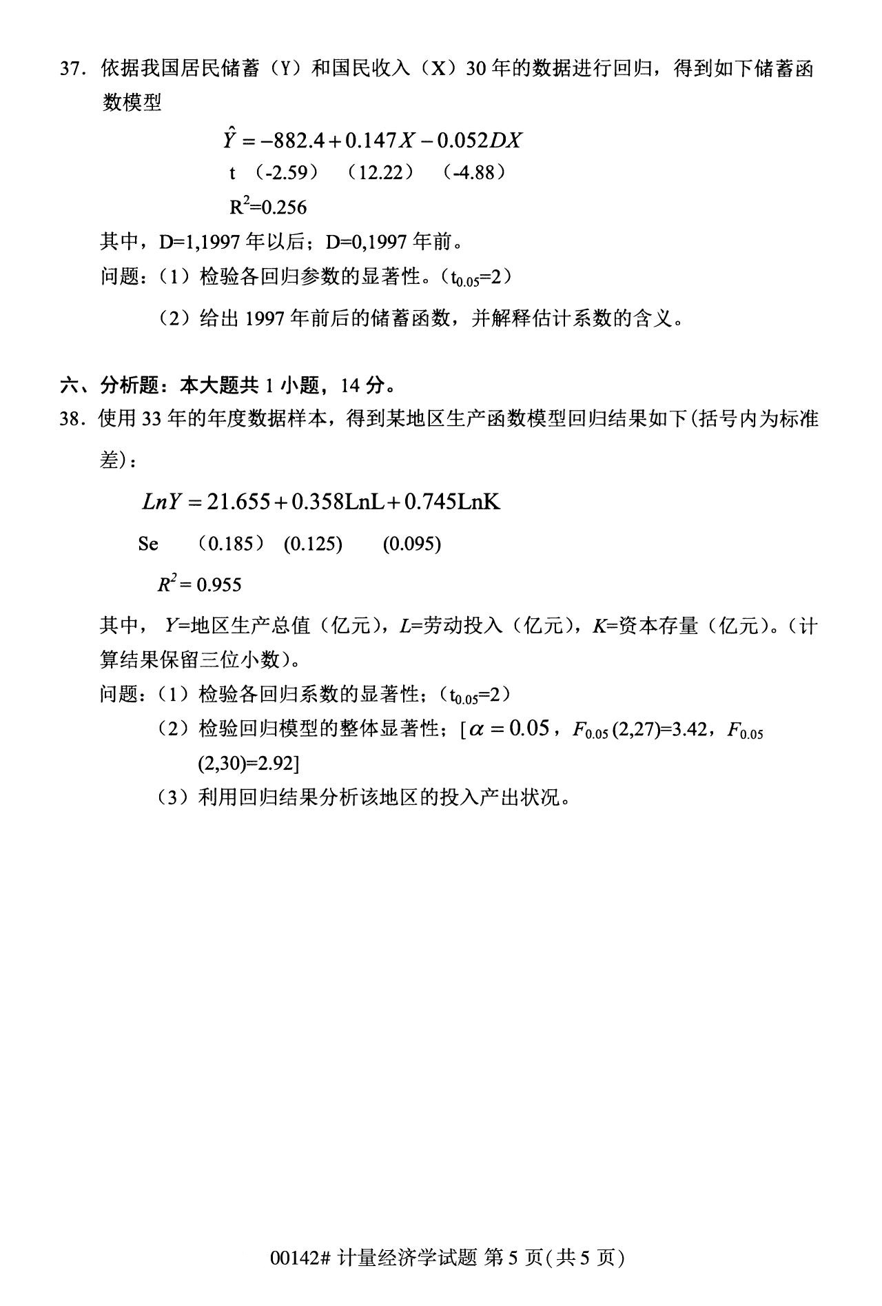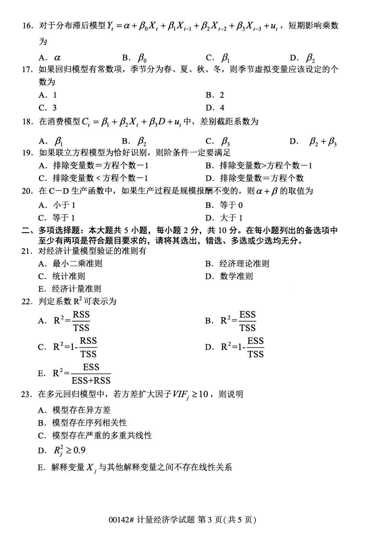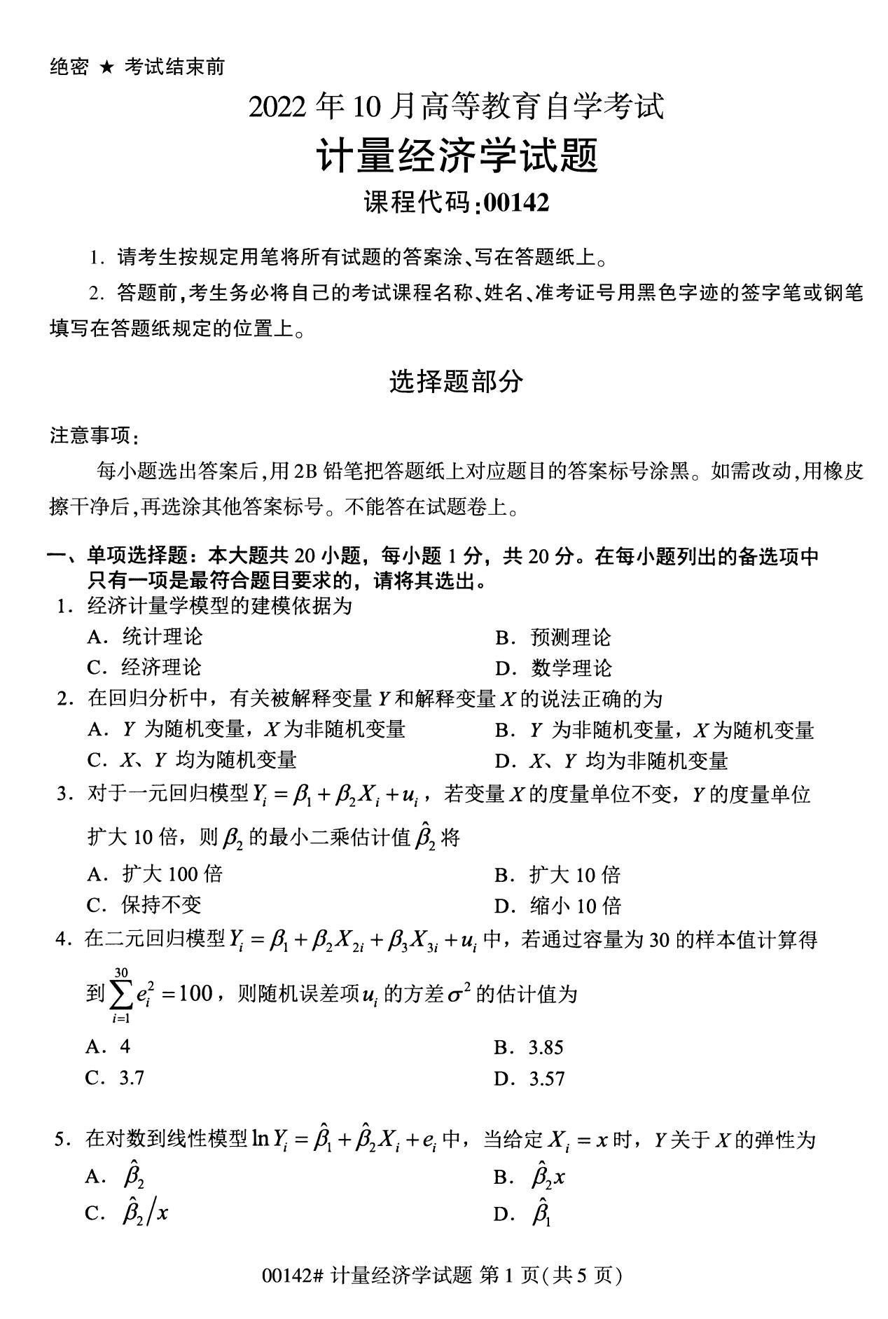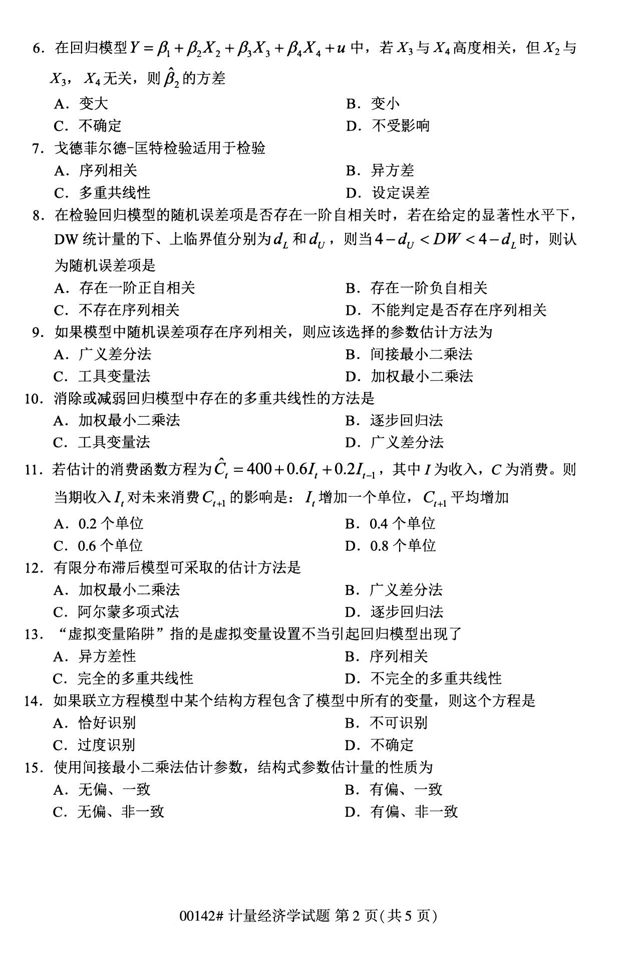 2022年10月浙江自考00142计量经济学试题