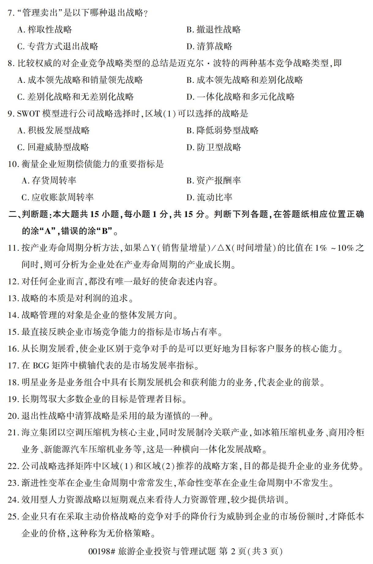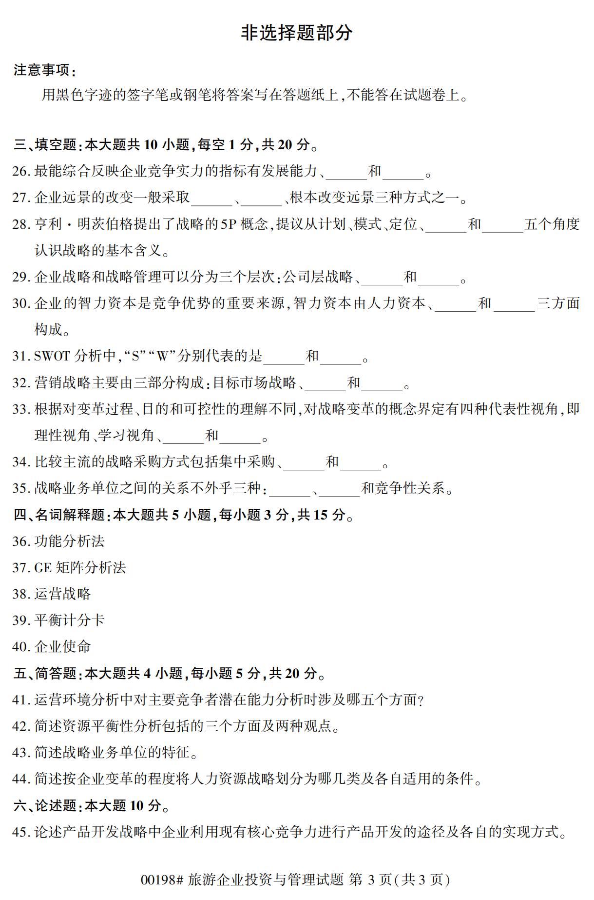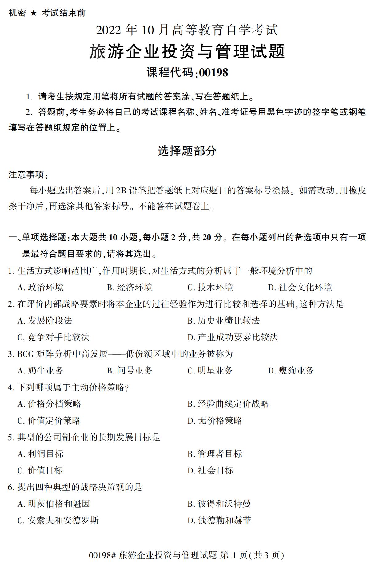 2022年10月浙江自考00198旅游企业投资与管理试题