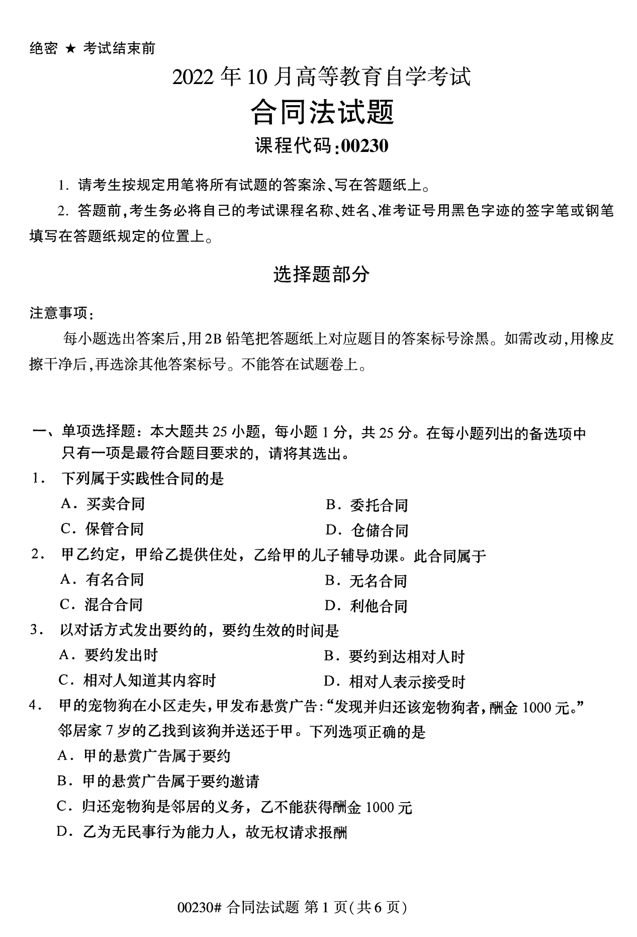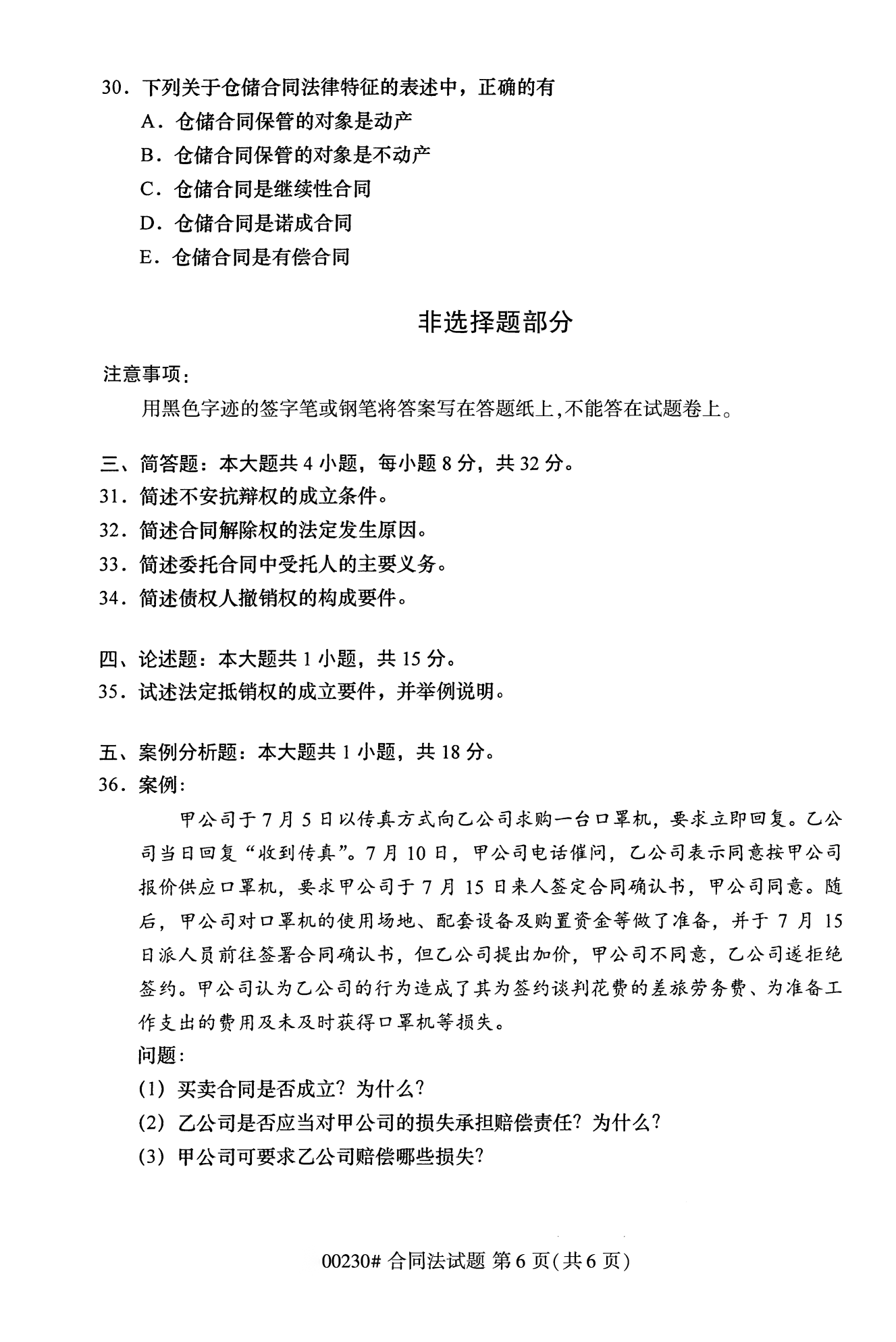 2022年10月浙江自考00230合同法试题
