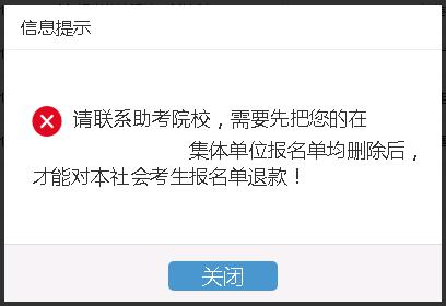 (4)集体单位(助学院校)考生由集体(助学院校)单位负责名费申请退款。集体单位(助学院校)考生作为社会考生自行报考的课程,其中理论课程按流程报名费申请退款,实践(论文)课程按流程报名费申请退款时,系统如出现如下信息提示,考生须联系所在集体单位(助考院校)先行处理后,再按流程进行报名费申请退款。