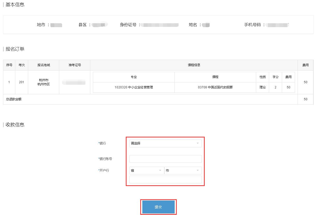 3.填写收款信息,核对确认无误后“提交”